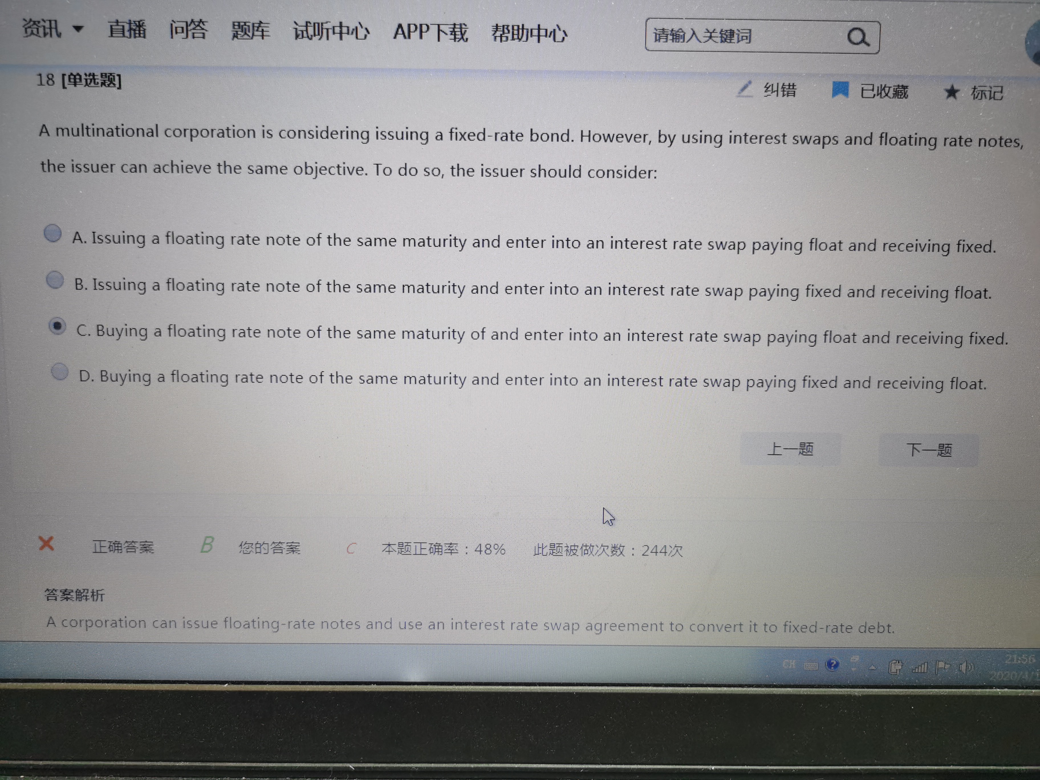 同学你好,这道题问的是一个跨国公司想通过一个利率互换和一个浮动利率债券的组合完成发行固定利率债券的目标,也就是两者最后的结果是一样的;根据B选项,公司可以发行一个浮动利率债券,同时买入一个互换合约(付固定收浮动),把收到的浮动利率支付给浮动利率债券的债权人,两者抵消,只剩下一个互换中的付固定利率。也就相当于发现一个固定利率债券。浮动利率notes可以反映称浮动利率票据或浮动利率债券。