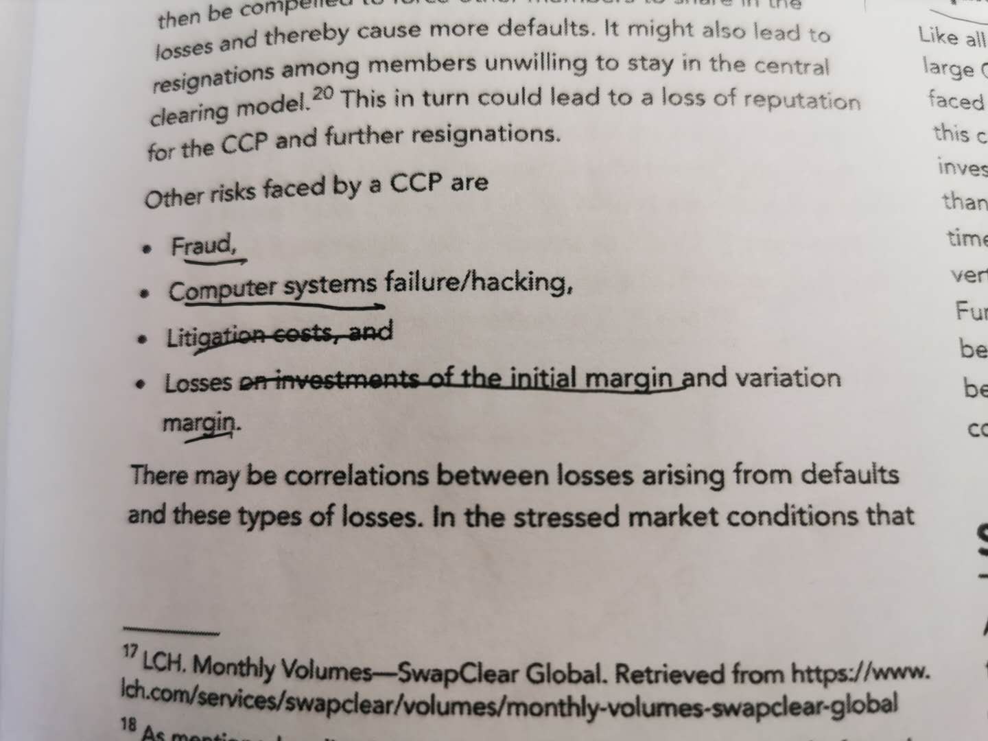 同学你好,你发的图片中划线部分的最后一条说的是关于初始保证金和变动保证金的投资资金的风险,本质上还是跟会员违约风险有很强的相关性。图片最后一段也说明了这点。 而D选项说的是由于投资行动超出了规定的投资政策导致的保证金损失的风险,两个说的不是一个意思。