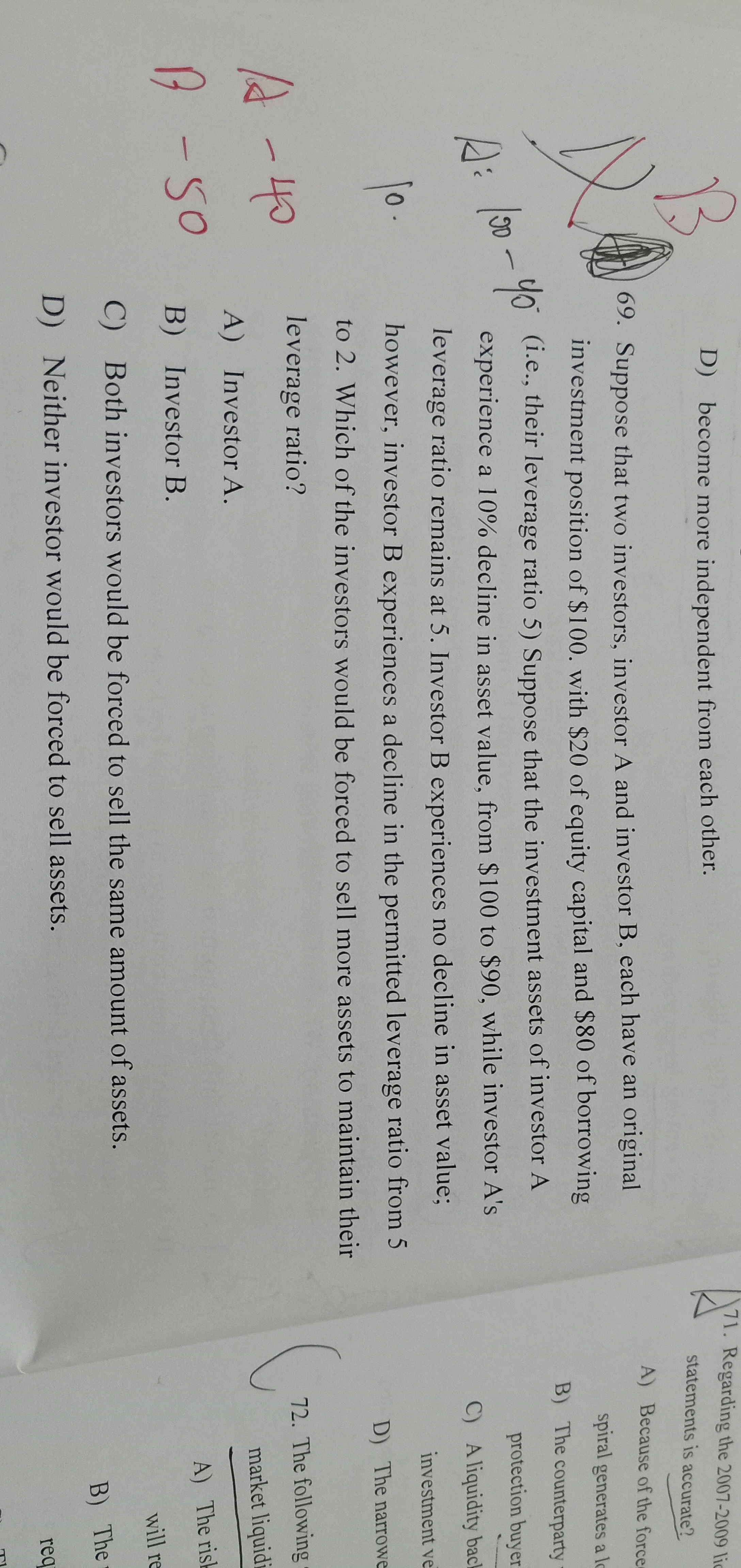 同学,题目问的是哪个投资者需要卖的资产更多。答案已经对计算过程解释的很清楚了,投资人通过杠杆买入资产,资产价值下降,为了维持杠杆比率,那投资人就需要卖掉一部分资产。杠杆比率下降,意味着投资人原本用20块能借80块,现在只能用20块借20,所以要卖掉60的资产。A需要卖40,B需要卖60,所以B需要卖的资产更多。