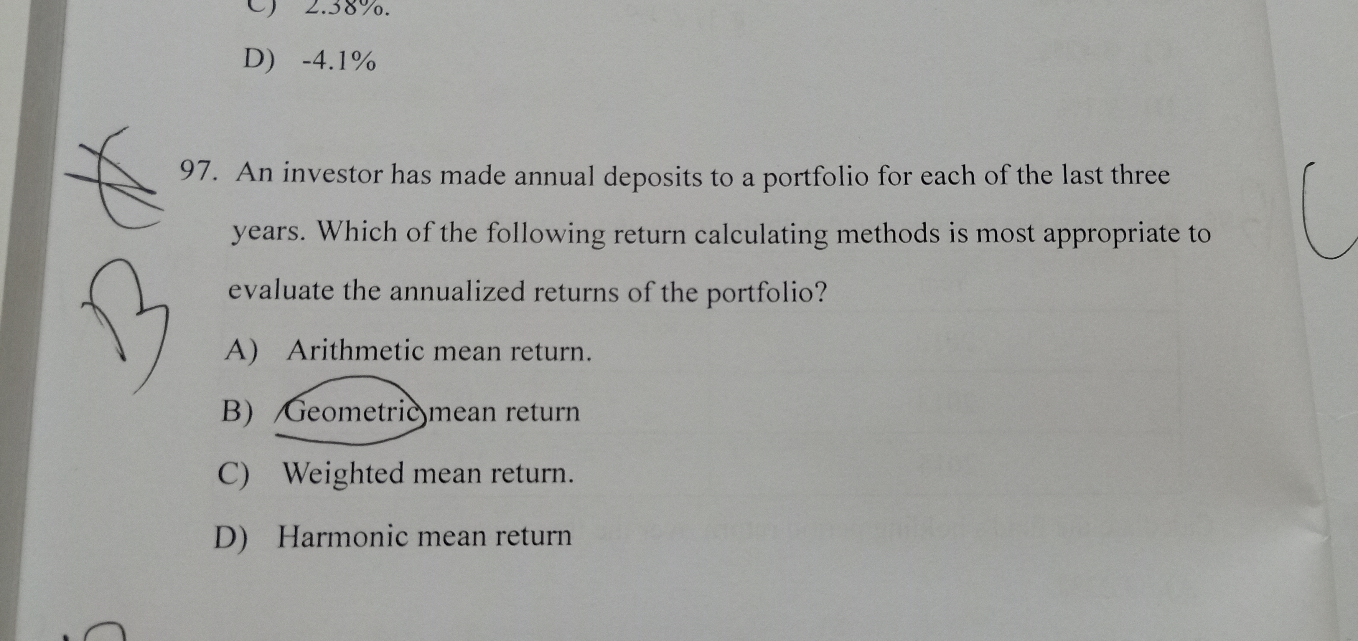 同学你好,A选项是算术平均,B选项是几何平均,C选项是加权平均,D选项是调和平均,其中衡量资产在某一期间内的年化收益率一般就用几何平均法。