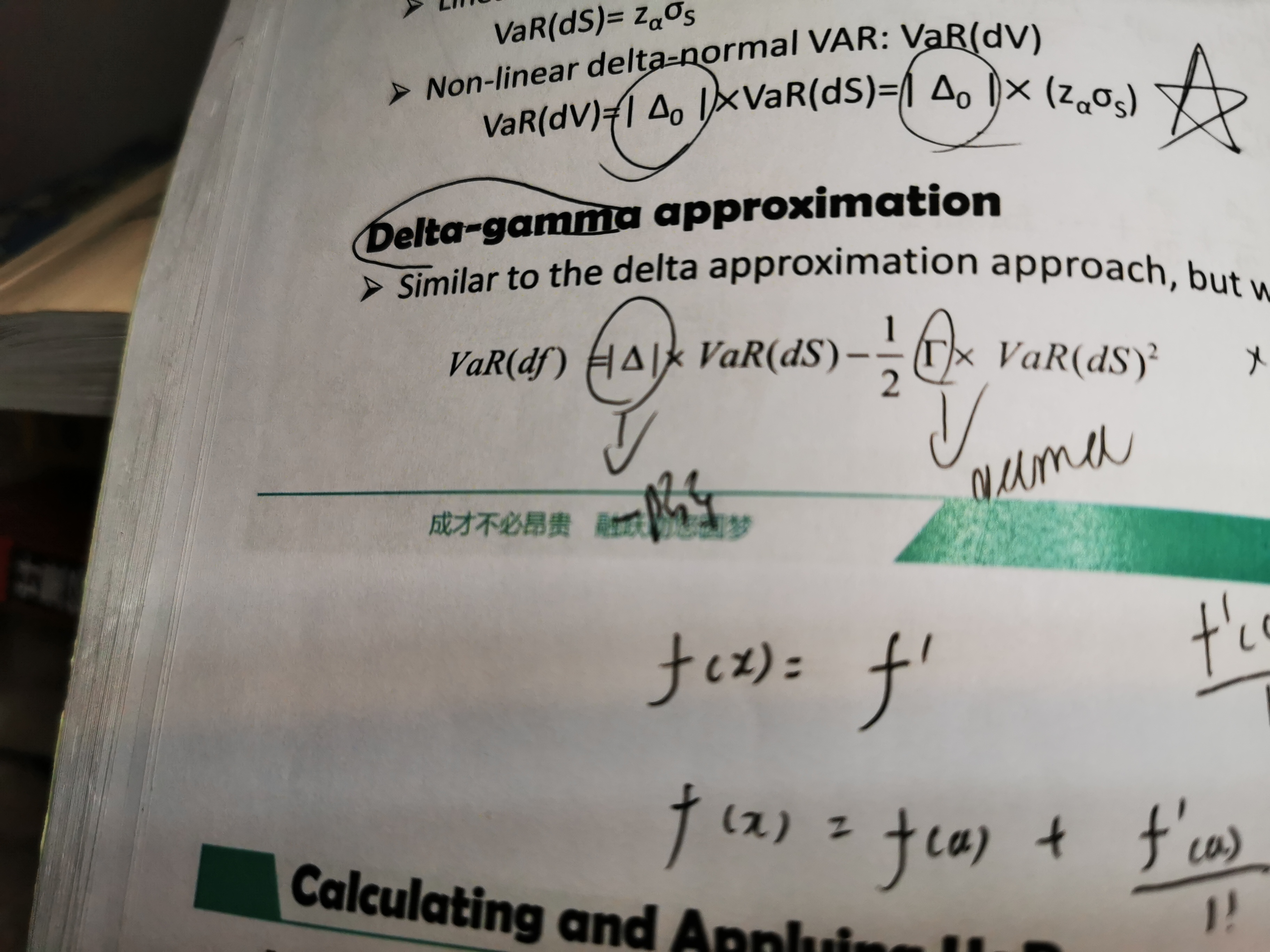 同学你好,原版书上的公式反映的是期权价格变化与标的价格变化的比率。但是我们课件上的公式计算的是VaR。原版书上的公式你可以理解为,delta normal反应的标的价格变动一个单位,期权价格变动多少,delta gamma是因为delta normal对微小变化考虑的不充足所以引入了二阶项,希望可以将变化进行更细的分解。但是不管怎么说,公式都在计算的是标的价格的变动对期权价格的影响。然而我们课件上,要求计算的是VaR,VaR代表的是损失。所以就要考虑一个方向问题。gamma对期权的影响就像凸度对债券的影响一样,我们讲过如果一个债券有正凸度,那么债券在涨的时候会更快,跌的时候会更少,所以当计算VaR的时候,凸度其实对债券损失是有个缓冲效果的,所以计算VaR的时候用的减,gamma也是同理。