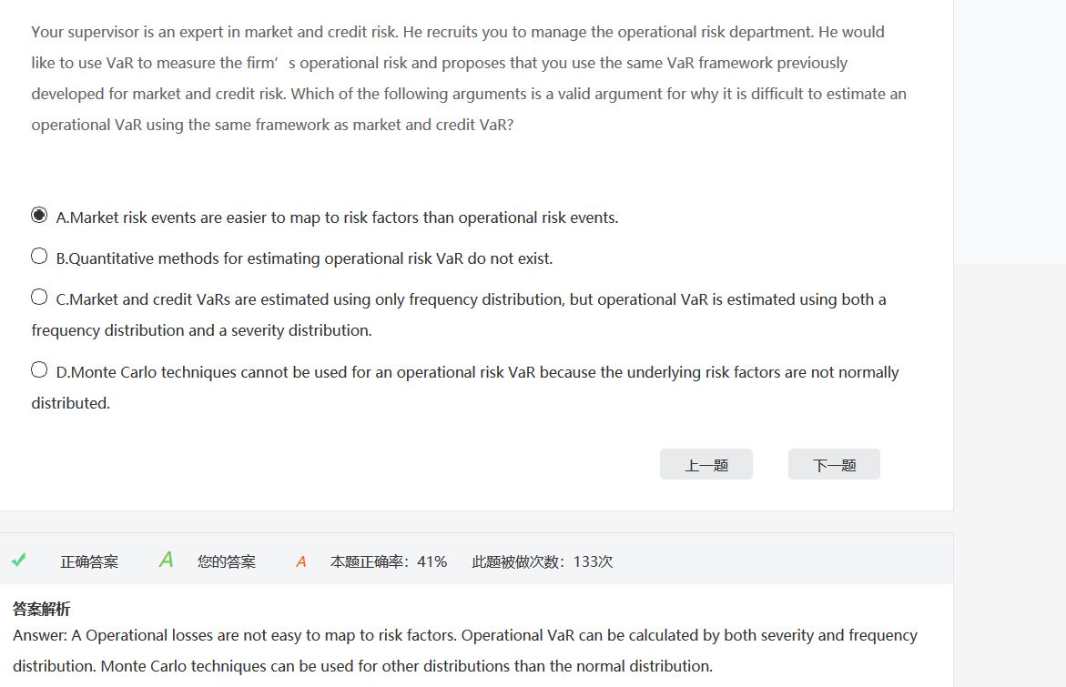 同学你好,这道题考察的是操作风险章节高级计量法部分内容,频率分布指的是用来刻画风险事件发生频率的分布,severity分布指的是损失发生程度的分布,前者一般用泊松分布,后者一般用对数正态分布、指数分布。