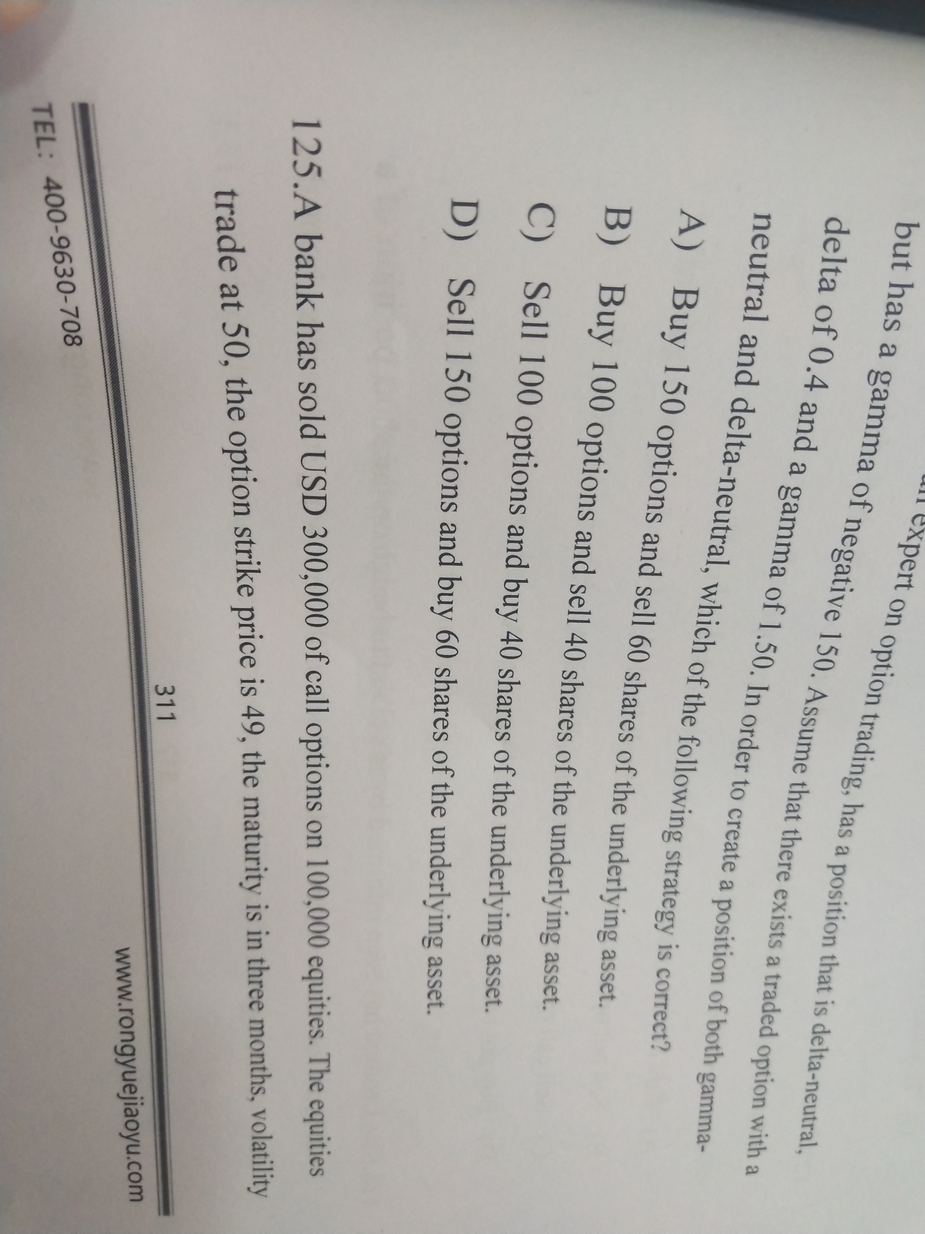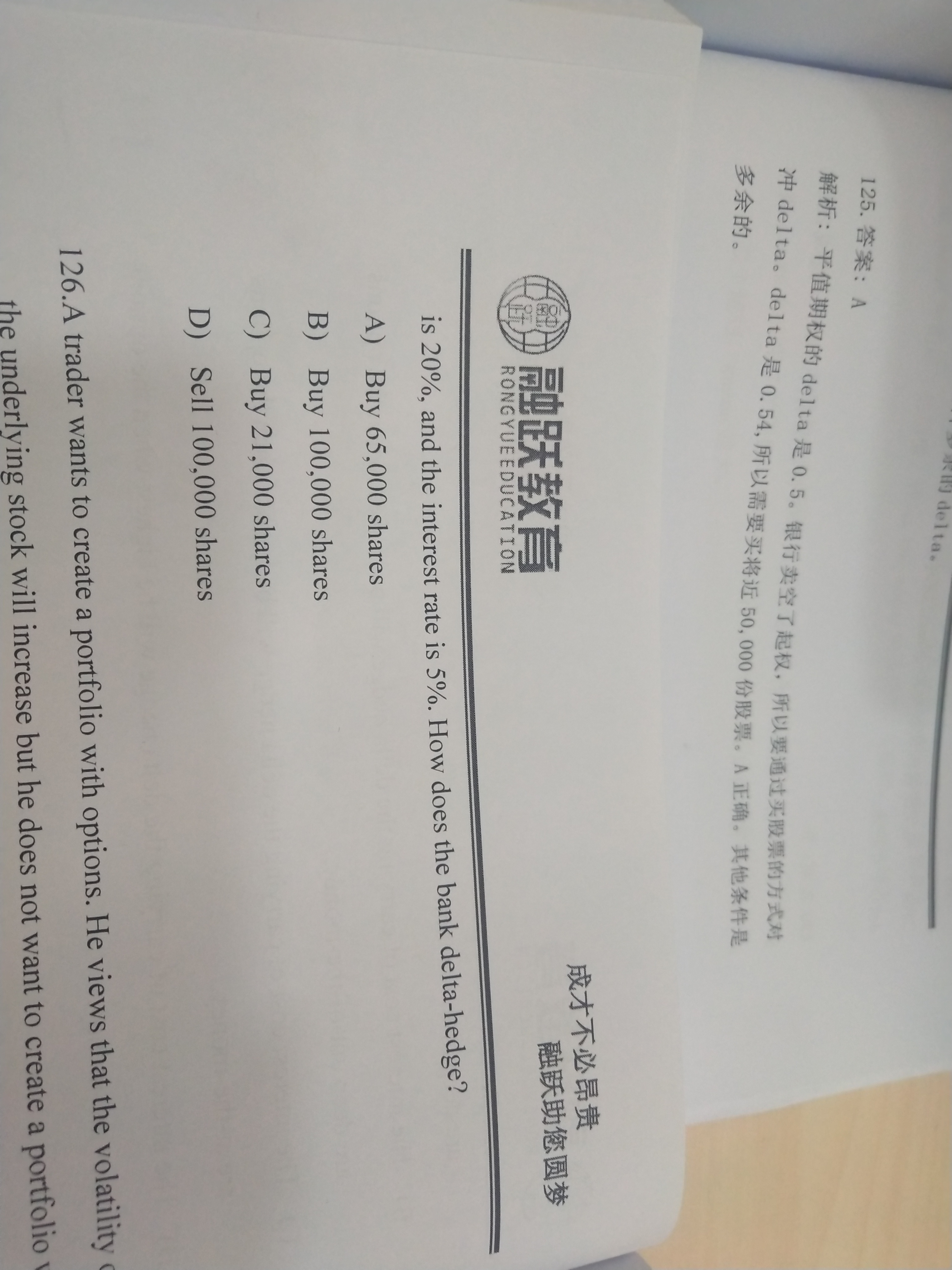 同学你好,这道题你可以这样理解,因为期权的标的资产目前的价格S为50,期权执行价格为49,也就是说目前期权处于平值附近,delta约等于0.5(0.54应该是写错了,应该是0.5),已知卖空期权,对冲就是要买入标的资产的数量大约就是100000*0.5=50000,A最接近答案,所以选A