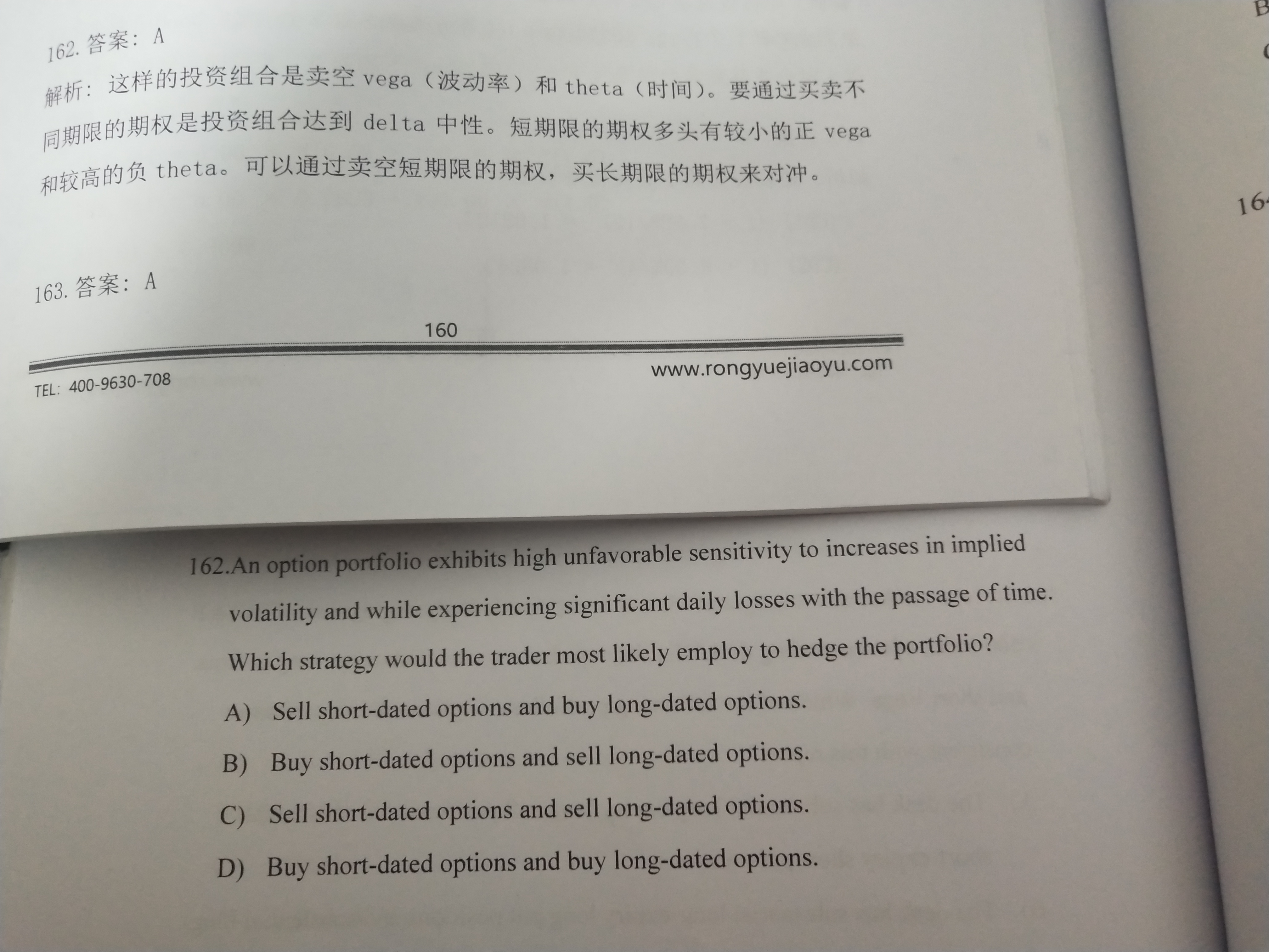 同学你好,根据题意,现在的情况是高Vega和高theta,要对冲这样的组合,就是要卖空Vega和theta。