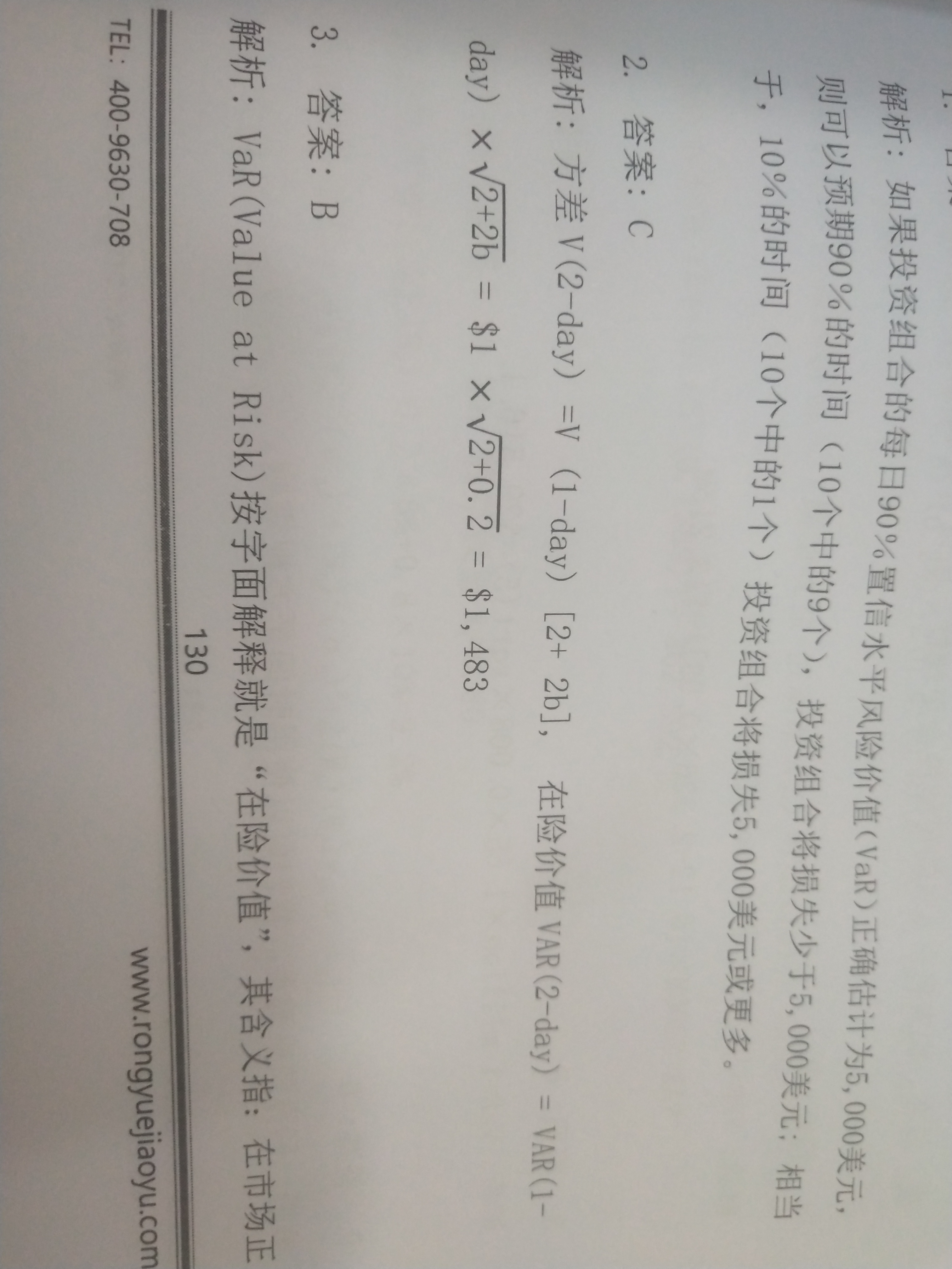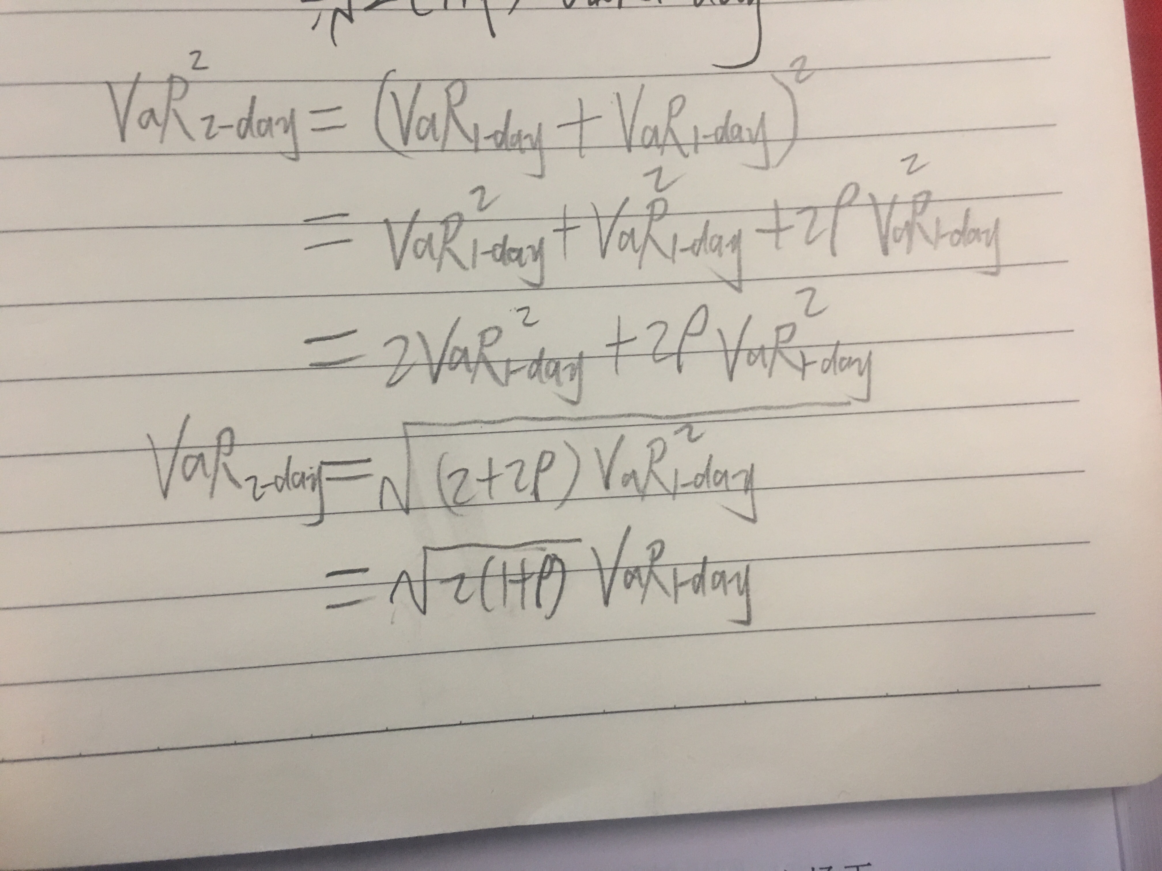 同学你好,这道题考察的是在相关性不为零的情况下利用平方根法则计算VaR的计算公式,具体参考下图片