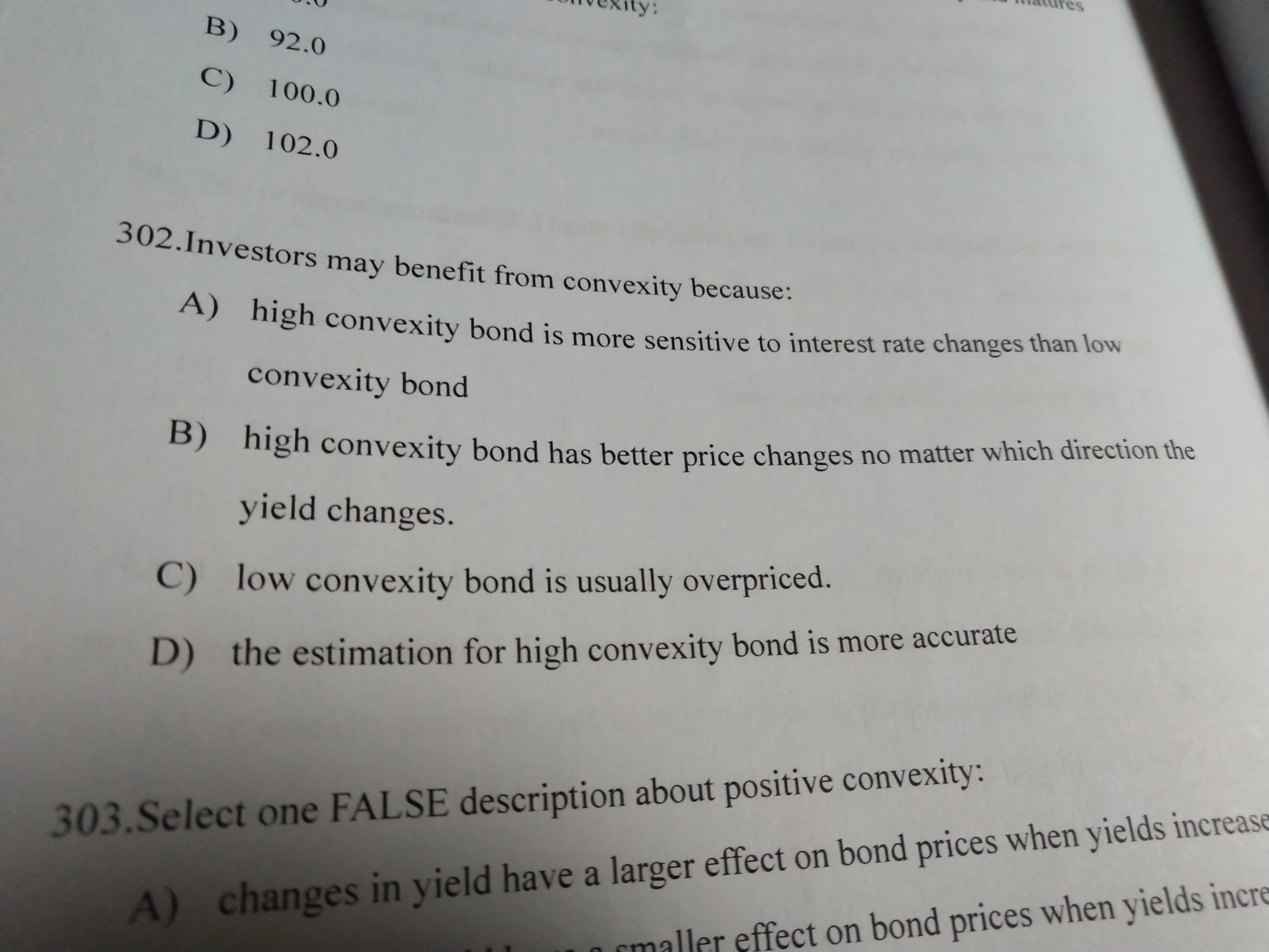 同学你好,题目问的是哪些凸度的性质对投资者来说是有好处的,显然是涨多跌少的性质,也就是B选项所说的性质,而A选项说的是凸度较高的债券对利率的敏感性更高,这点在利率上涨时债券价格跌的更少,所以A选项只说对了一半。
