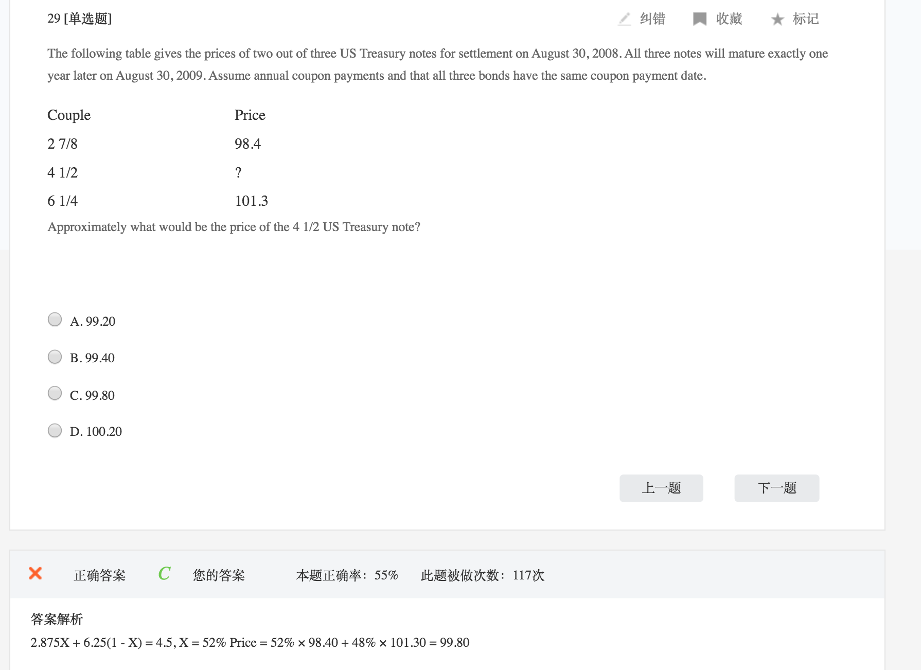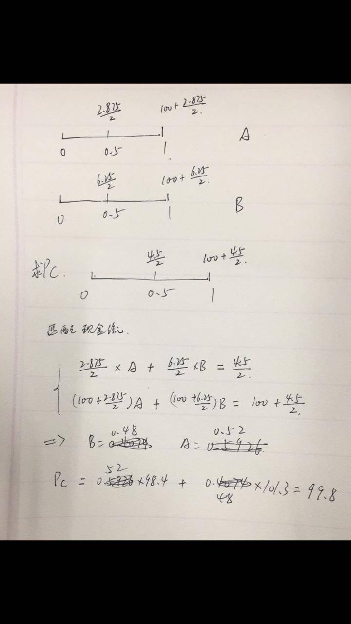同学你好,这道题考察的是付息债券的复制,主要是使用现金流匹配法计算。详细答案看图片,不用纠结题目中给的答案,上面写的不是很清晰。
