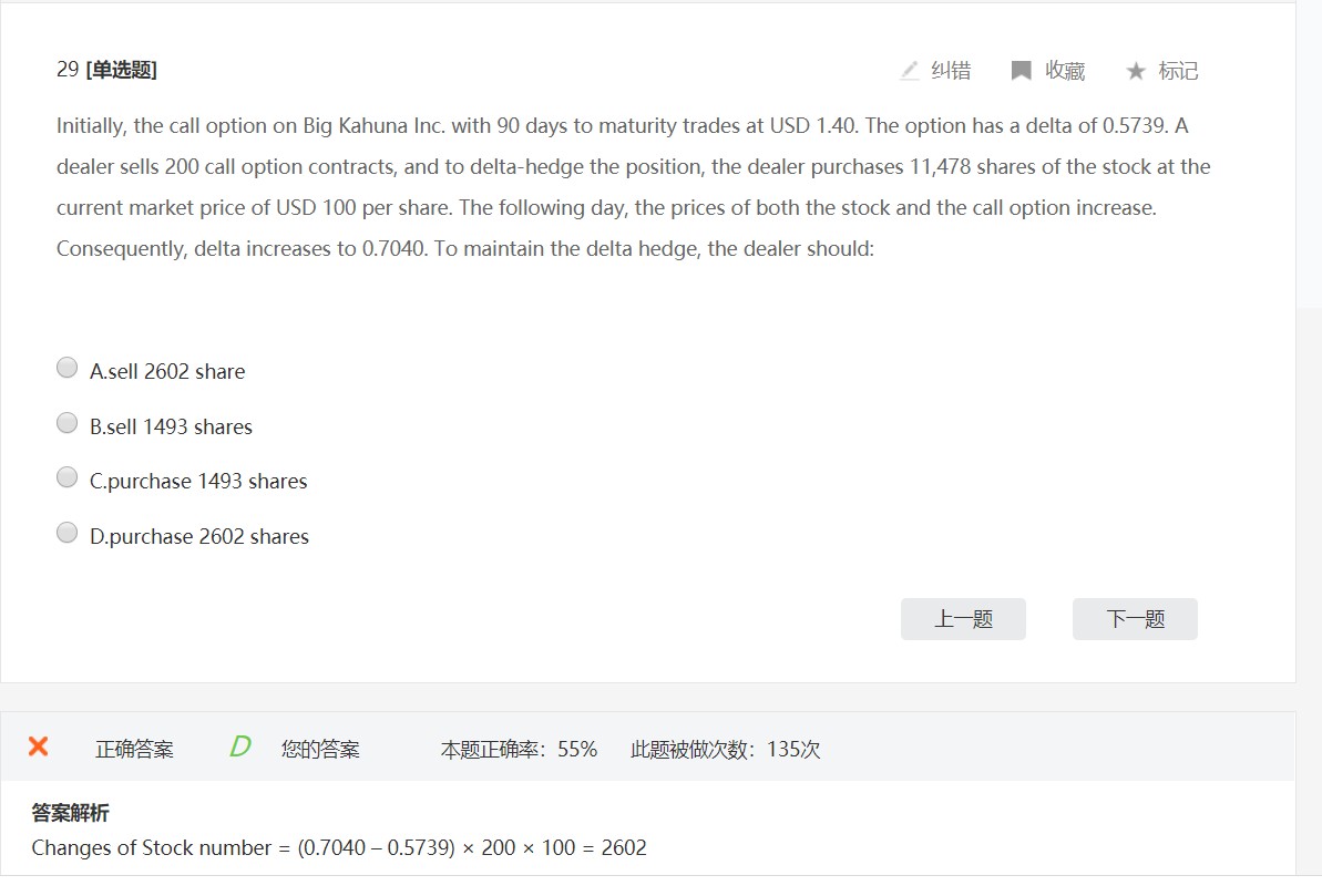 同学你好,这道题题干中的11478小数点应该标错了,应该为114.78,答案中不用再乘以100,相应的选项也都需要修改。delta对冲的计算跟标的资产价格没有关系。