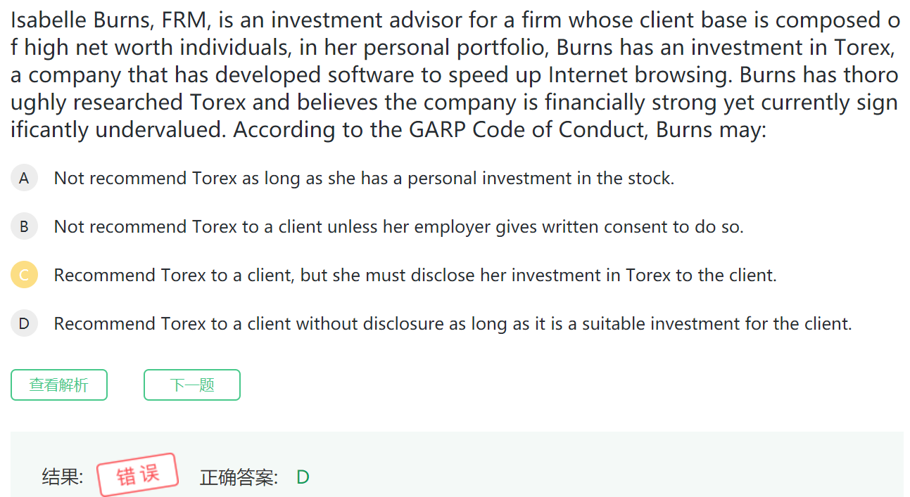 同学你好,在FRM中的职业行为准则中,只要投资顾问的投资建议是符合客户实际情况的且是建立在尽职调查基础上的、投资顾问自己的持仓操作与客户的利益没有冲突,是可以不用披露给客户的。