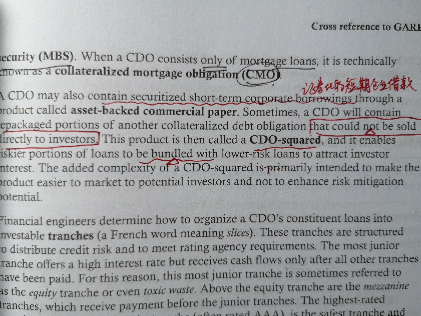 同学你好,CDO-squared是把现存的多个CDO产品,再进行组合,你中有我,我中有你,让一批房贷同时向多个CDO提供现金流,同学了解即可,不需要掌握。