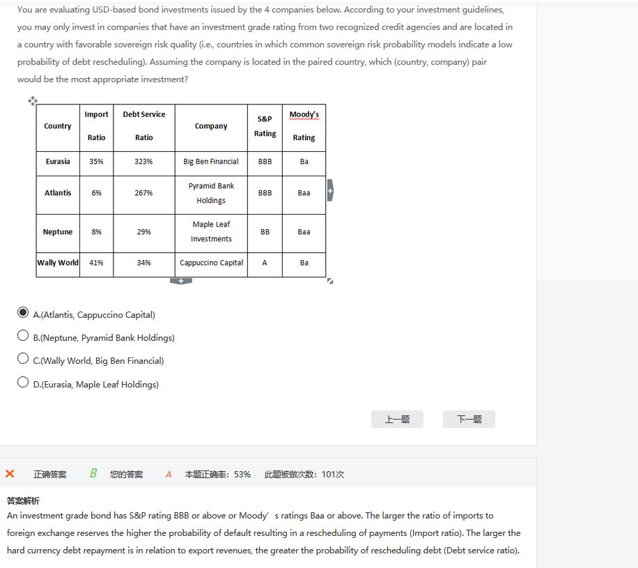 同学你好,你看错了吧,B选项公司都是3B级呀,是属于投资级的。