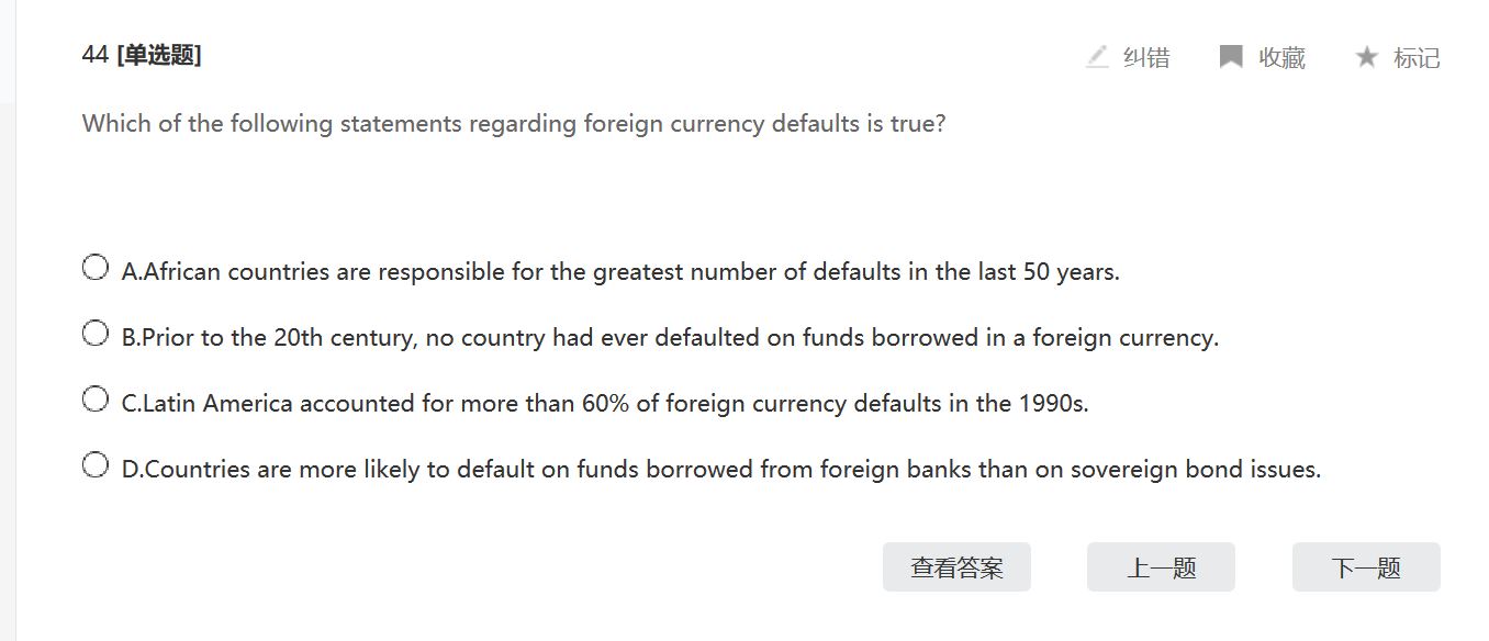 同学你好,这道题A选项错误,应该是拉丁美洲是过去50年里违约数量最多的国家,B选项说的太绝对,错误;C选项时间错误,应该是过去50年而不是上世纪90年代。D选项正确,由于国家可能没有足够的外币来履约,与主权债券相比,国家更容易对外资银行违约。这部分内容对应第四章国家风险之主权违约一章。
