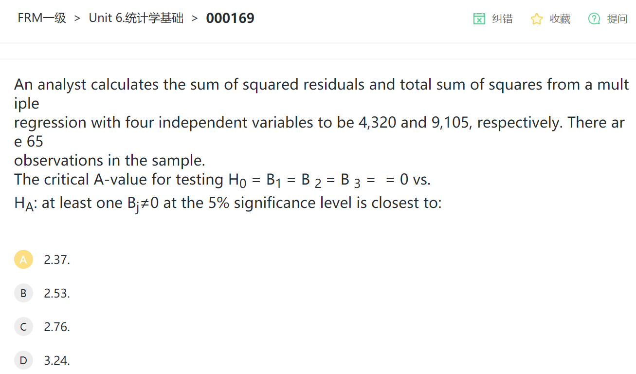 根据题意,这道题应该让算的是F分布在自由度,n1=4,n2=65-4-1=60时的关键值,查表为2.53.