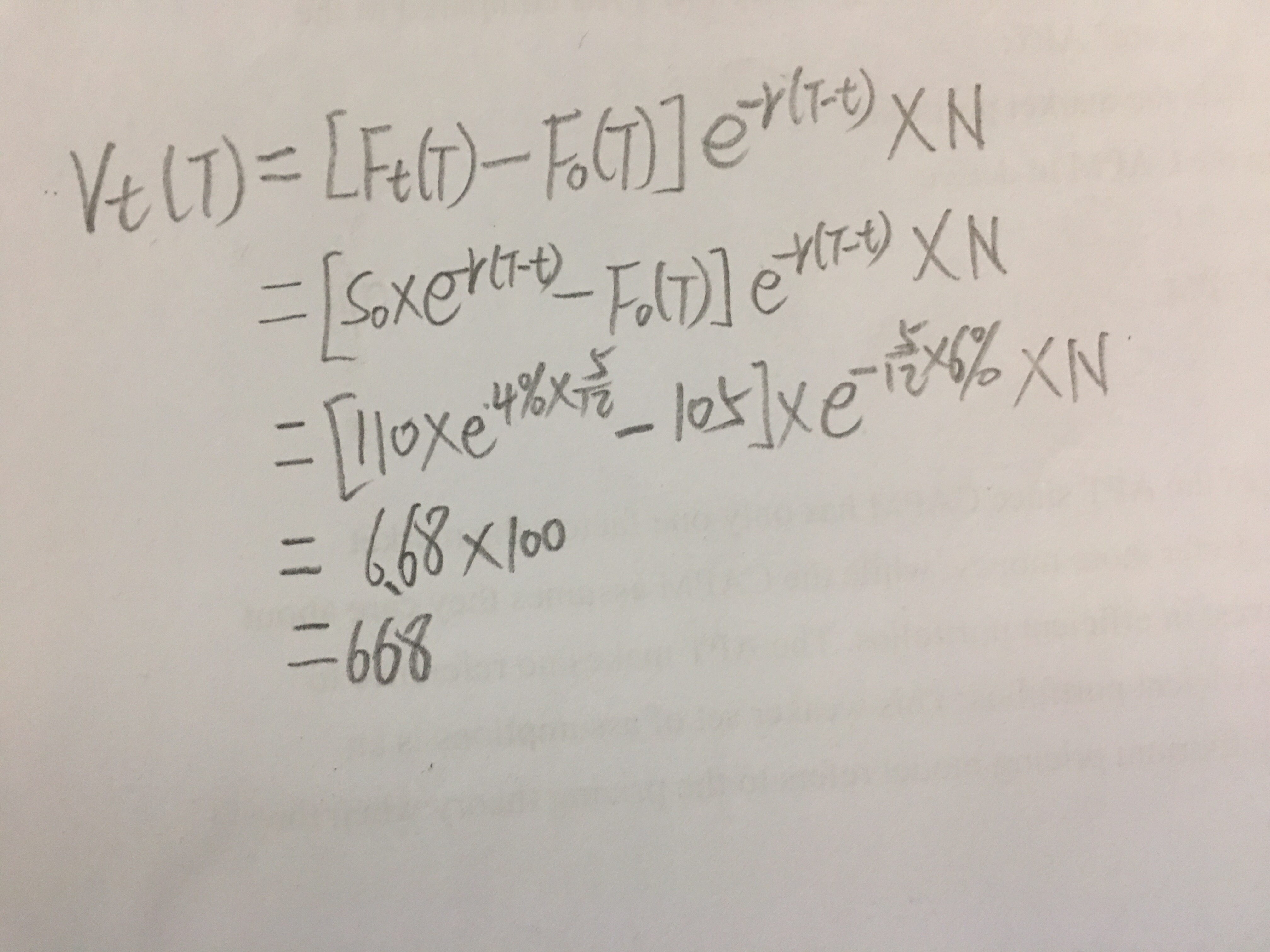 同学你好,这道题考察的是t时刻远期合约的价值,等于理论上的远期价格减去目前市场上的远期价格,然后折现到现在的现值。具体计算参考下图。