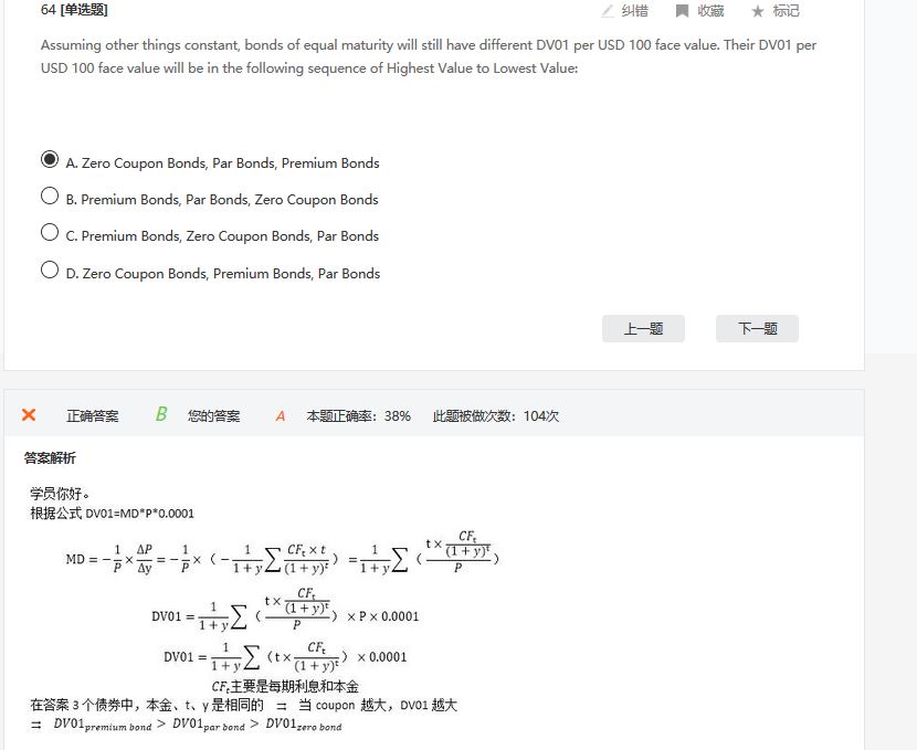 premium bond 是溢价债券,coupon高于yield; par bond 是平价债券,coupon等于yield,zero bond 是零息债,coupon最小。coupon越高久期越小,所以应该选A。