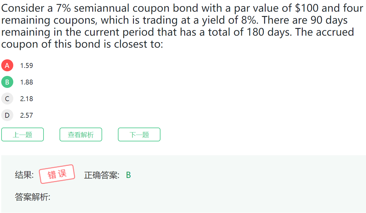 同学,计算过程是半年的coupon等于0.5*7%*100=3.5,计算应计利息是,3.5*90/ 180=1.75.所以准确的答案是1.75,选项中选最接近的答案。