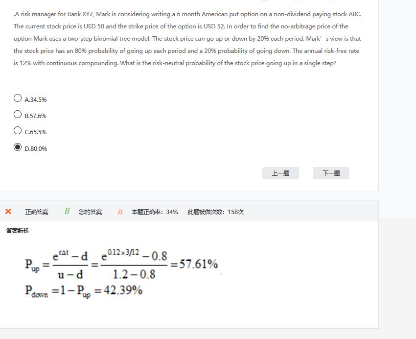 同学你好,题干中第三行已经说明:the stock price can go up or down by 20% each period, 这句话的意思是股票价格在每期可以上涨20%,也就是原来价格的120%即u=1.2,同理也可以下降到原来价格的80%即d=0.8。后面那句话是干扰项。