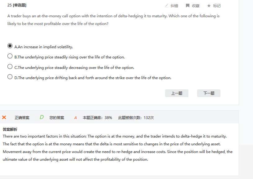 同学你好,这里所谓的最大利润是指原先的对冲组合,对冲的效果达到最佳。那么他只做了delta对冲。并且是对冲ATM的期权。所以他的对冲效果只有在标的资产价格变动比较小的时候才是最佳的。因此只能是选D.ABC都是在讲标的资产变动较大的情况。