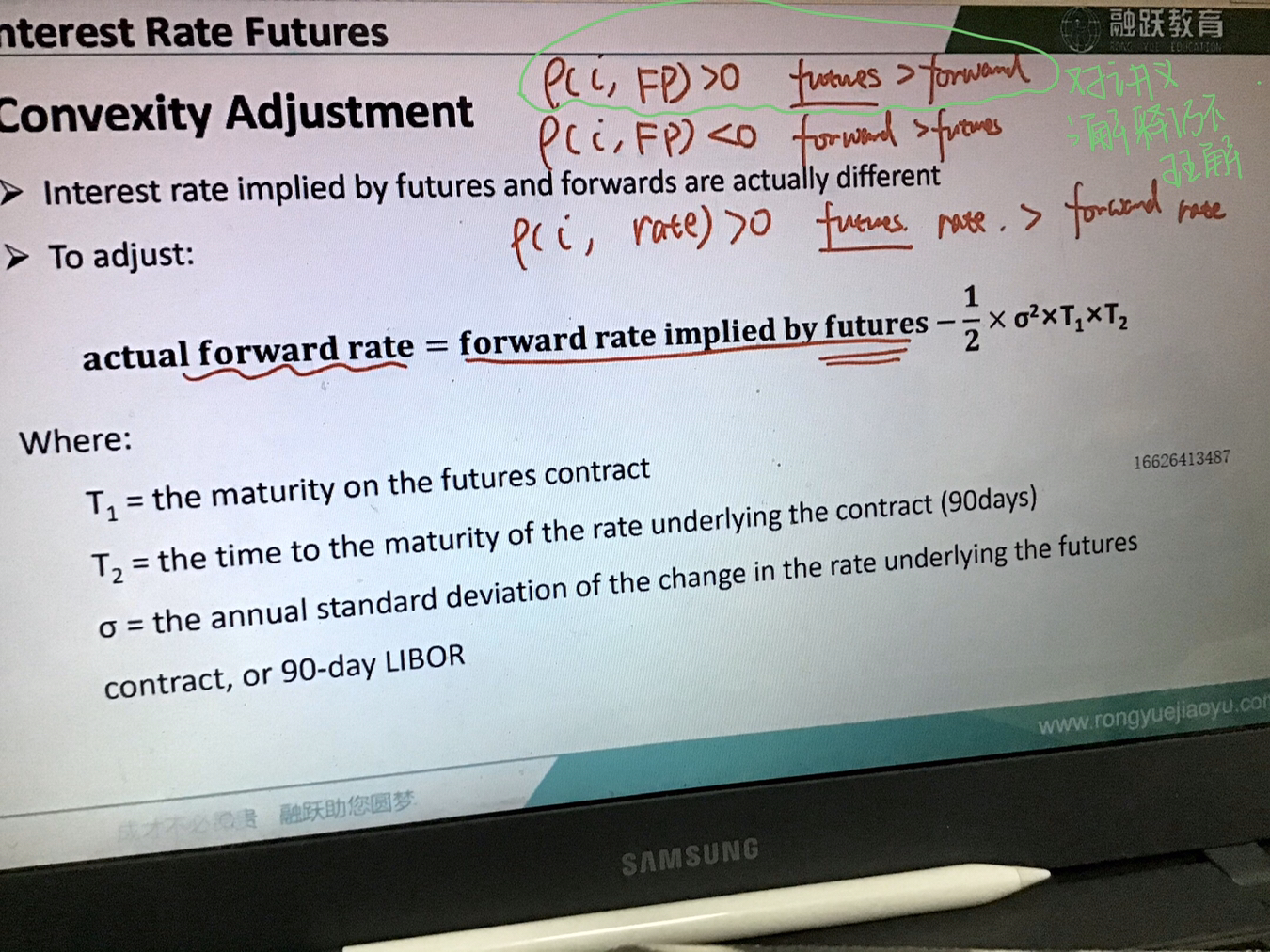 同学你好,因为期货的标的资产种类比较多,有的跟利率是正相关关系,比如黄金期货,有的跟利率是负相关关系,典型的比如债券;由于期货合约和远期合约因为结算制度的不同(即期货的每日结算制度),因为期货的每日结算制度导致利率的变动对期货和远期价格的影响不同,当利率与标的资产价格呈正相关的时候,当资产价格上涨,利率上涨,期货即时交割获得的现金就可以投入到利率更高的资产上从而获得更高的收益,所以此时期货的价格大于对应的远期价格,反之,当利率与标的资产的价格呈负相关的时候,当资产价格上涨时,期货交割获得的现金只能投入到利率更低的资产上从而获益减少,当资产价格下跌时,利率上涨,期货亏钱需要补充保证金,而此时由于利率上涨导致筹资成本上升,资金成本上涨,所以此时期货的价格小于对应的远期价格。由于国债一般情况下与利率是负相关关系,所以正常情况下,远期价格>期货价格,对应的远期利率就<对应的期货利率。