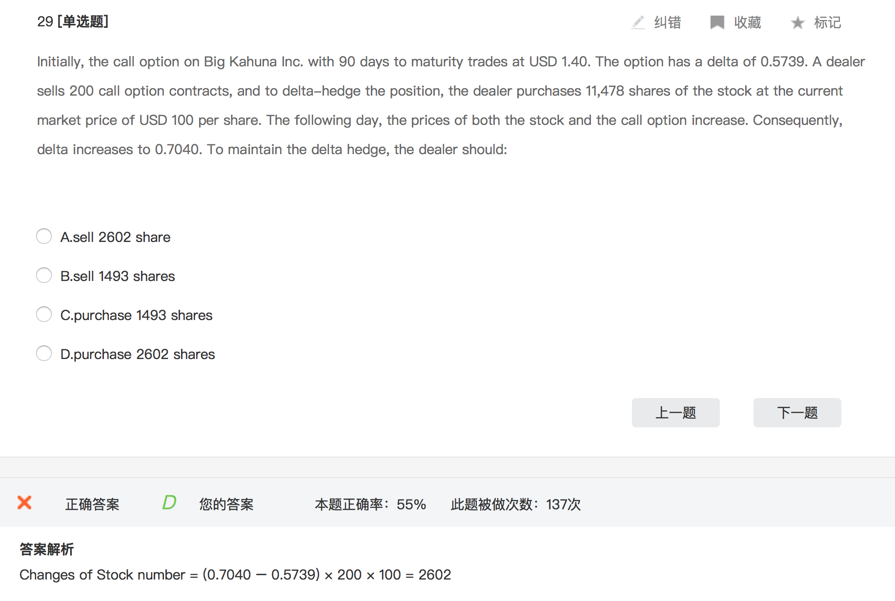 同学你好,这道题默认一份期权合约对应100份股票,所以代入delta对冲公式:股票的数量*1(因为股票的delta=1)+期权的数量(买入为正号,卖出为负号)*期权的delta=0,最开始delta是已经对冲了的,后来由于股票和期权价格上涨导致delta变化,所以需要重新对冲,只不过这次期权的delta变成了增量即0.7040-0.5739,代入公式计算即可。 (0.7040-0.5739)*200*100+1*股票的数量=0,即可求出对冲所需要的股票数量。
