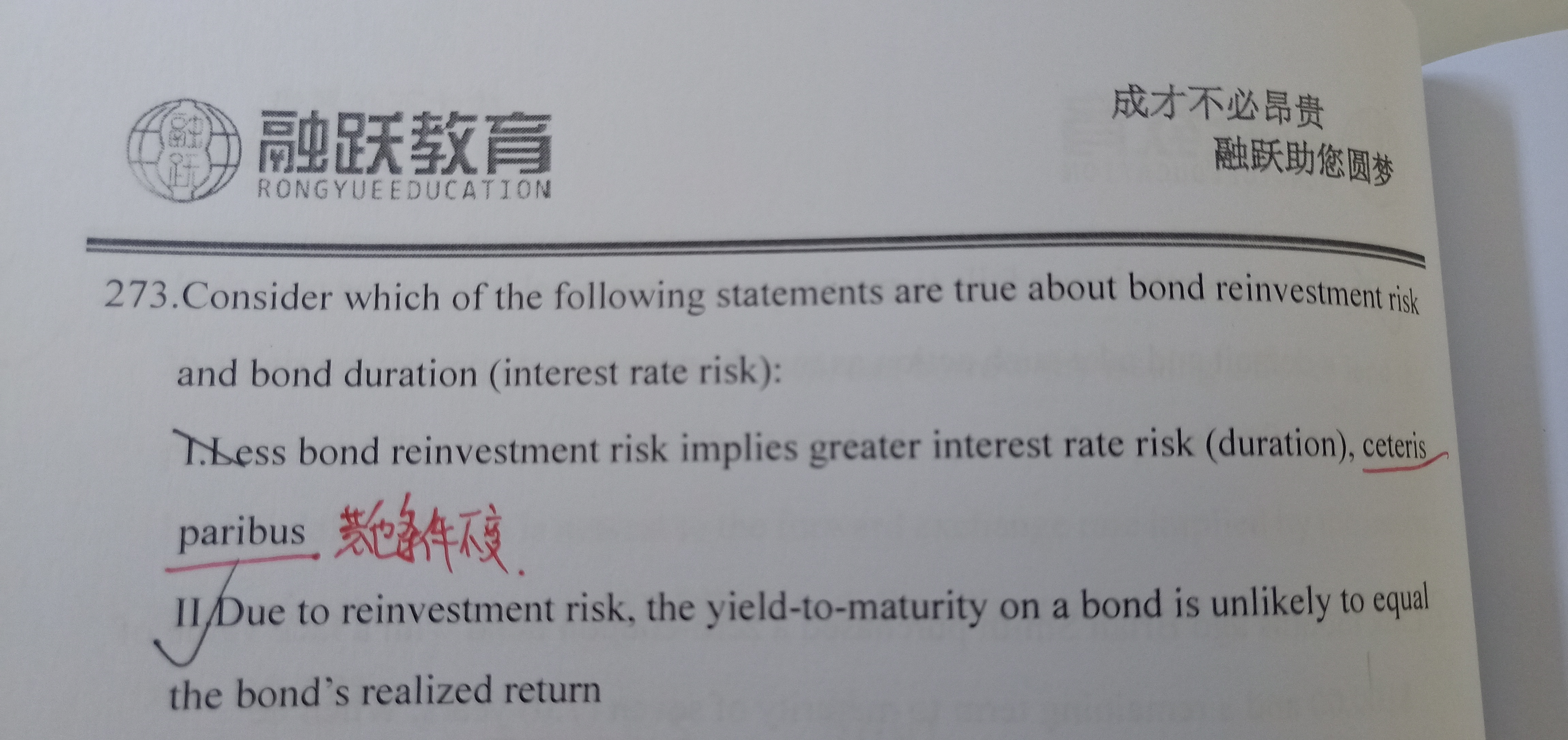 interest rate和reinvestment risk 是此消彼长。比如说零息债,没有再投资风险,但是interest rate是非常高的。所以第一个是对的。