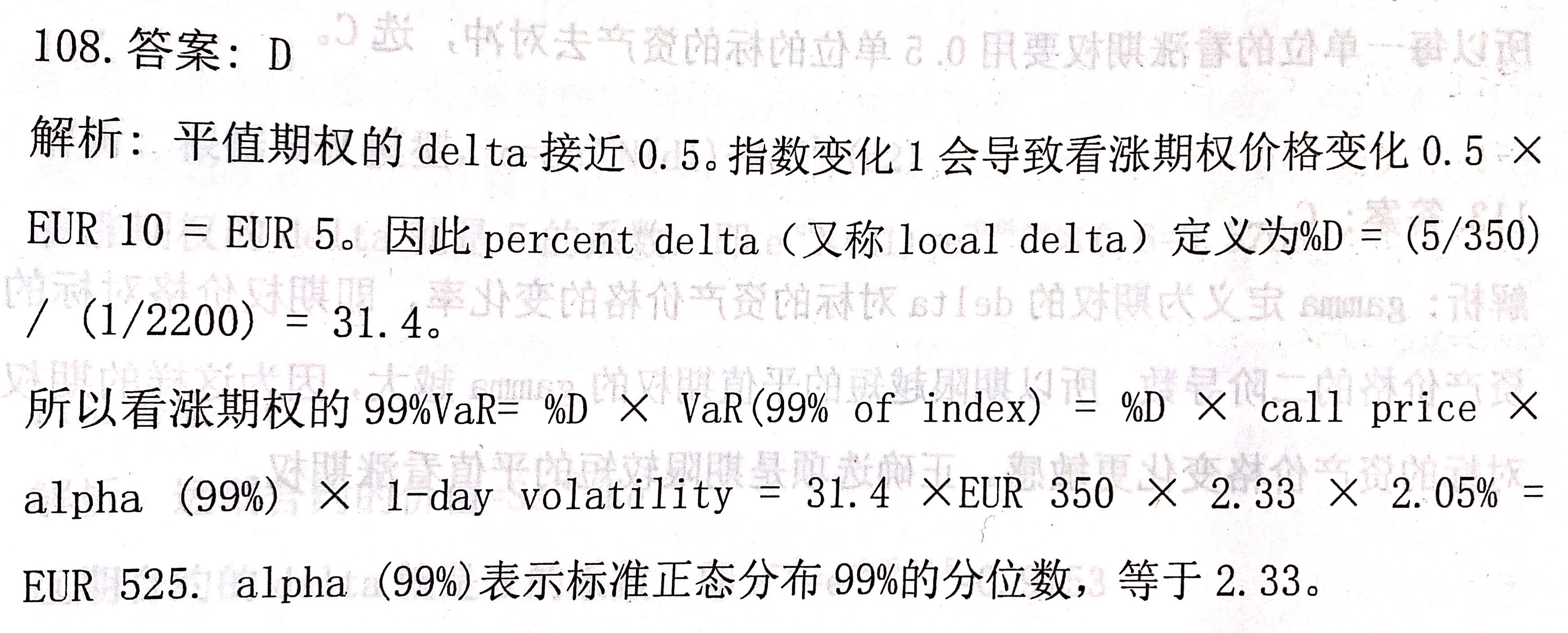 同学你好,答案中的方法比较偏冷门,同学还是参考下下面的方法吧 VaR(99% of Call) = D * index price * conversion * alpha (99%) * 1-day volatility = 0.5 * 2200 * 10 * 2.33 * 2.05% =EUR 525,