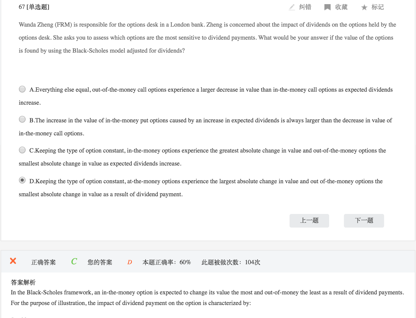 同学你好,因为分红的支付首先会影响现货的价值,进而会影响期权的价值,从希腊字母角度考虑,分红的支付会影响delta和gamma值,而delta和gamma的性质都是在实值期权时最大,虚值期权时最大,所以应该选C,而不是选D。C和D的区别不是“as a result of dividends payments"和”as expected dividends increase"的区别,而是一个是在实值期权一个是平值期权。