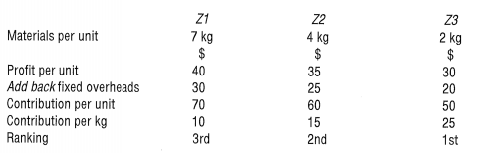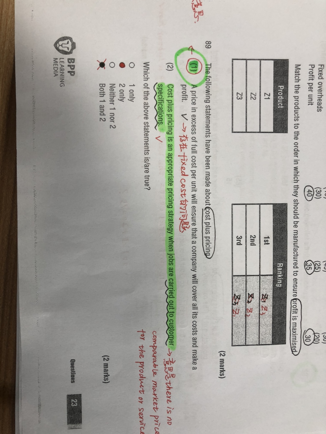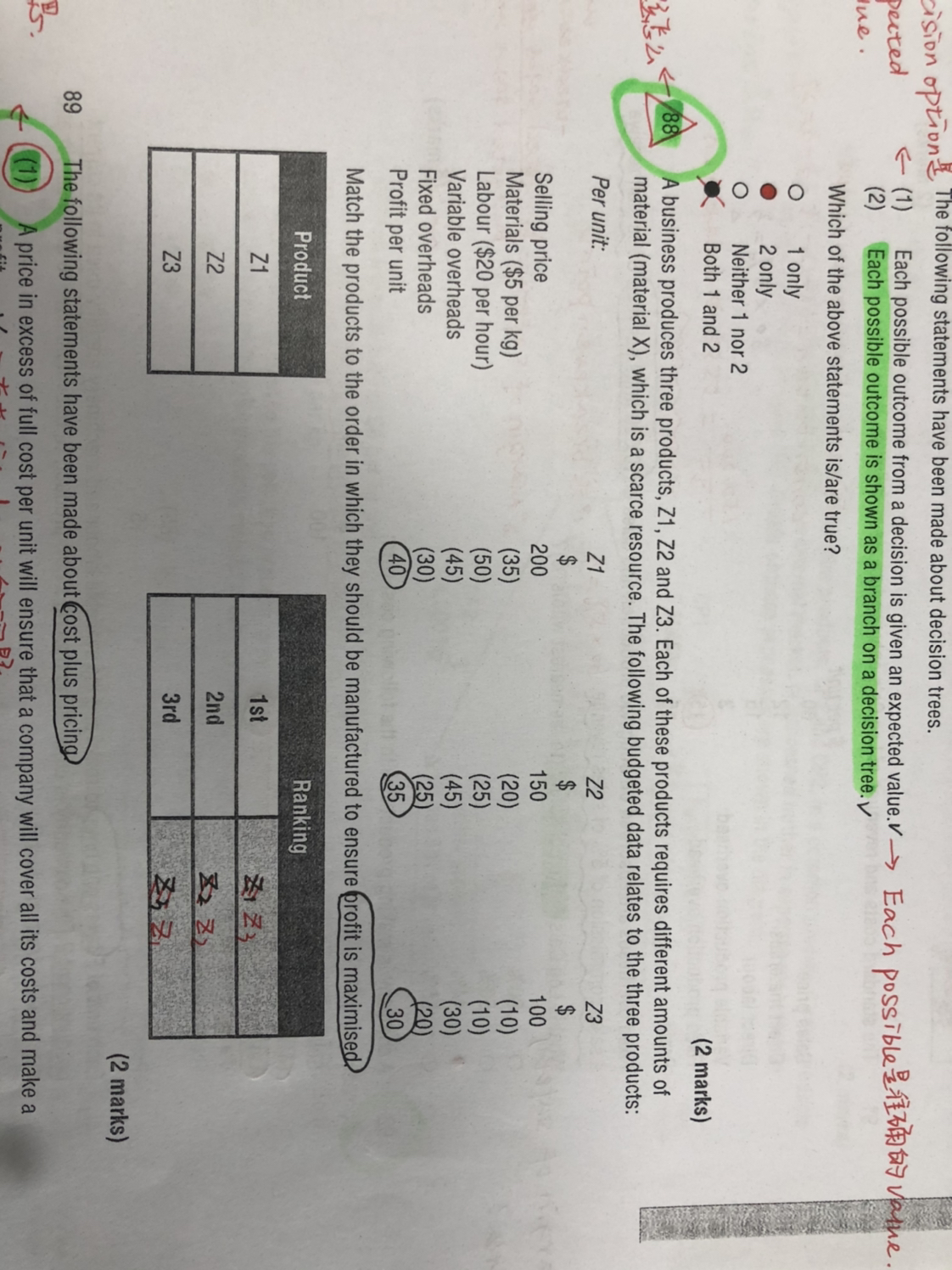 88.题目中提到material 是稀缺的,那么就以material 为主算出contribute per kg来排序。89.(1)costing plus pricing可以获取利润取决于能否在足够的能力水平上工作,像固定成本应该考虑在内。