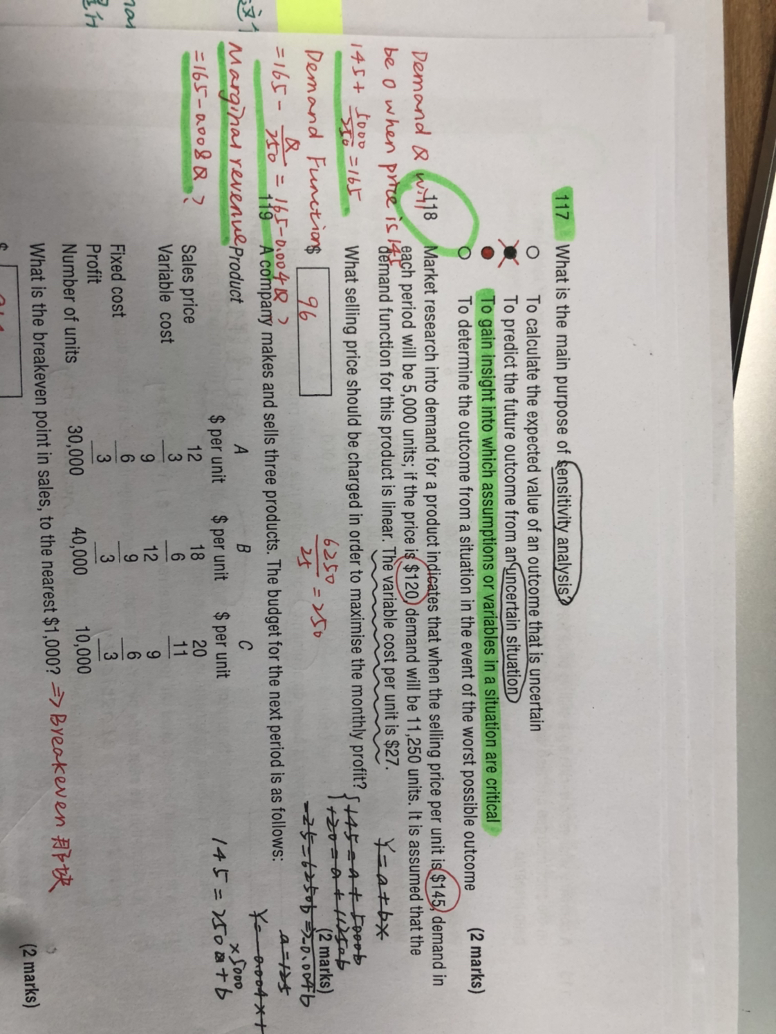 因为题干已经说了,价格和需求的两个变量的关系是线性的,所以设,Q=AP+B,P是价格,Q是需求量,所以代入两个数据,P是145的时候,Q是5000,P是120的是,Q是11250,所以就可以求出来A等于-250,B是41250,这个方程就出来了,就是需求函数,marginal revenue是边际收入,也就是P*Q得出的revenue对Q求导,就是边际收入了,边际的意思就是求导