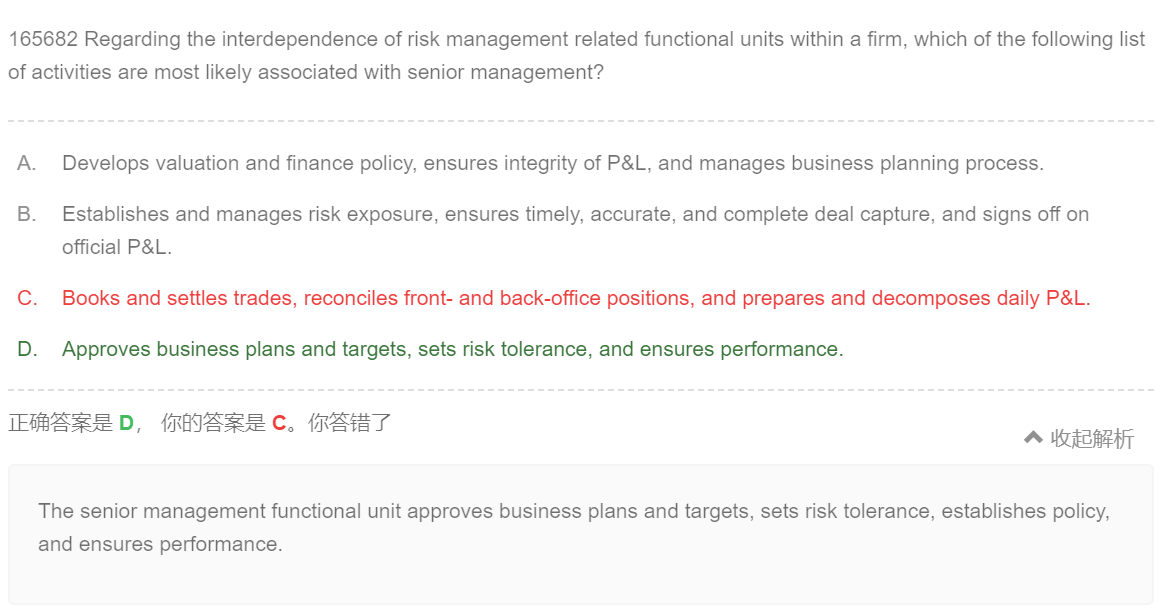 同学你好,D项描述的是高级管理者的责任,注意其中的risk tolerance是风险容忍程度的意思,而不是风险偏好,其他描述都是执行层面的东西,不是董事会的责任。