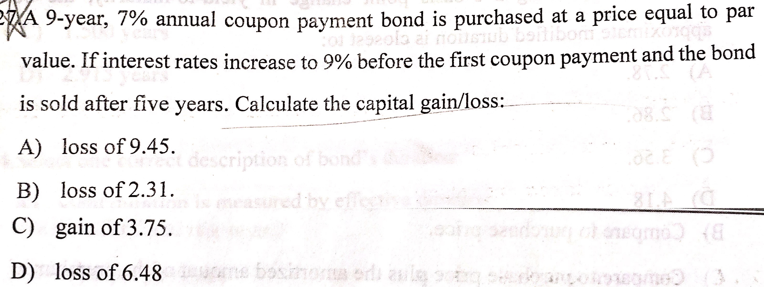 同学你好,这道题说的就是当利率从7%到9%时在第五年卖掉的损益,也就是求种利率情况下的现值之差。(因为题目已经说明在第一期票息支付之前就已经改变,所以对票息没什么影响),具体计算参考下图
