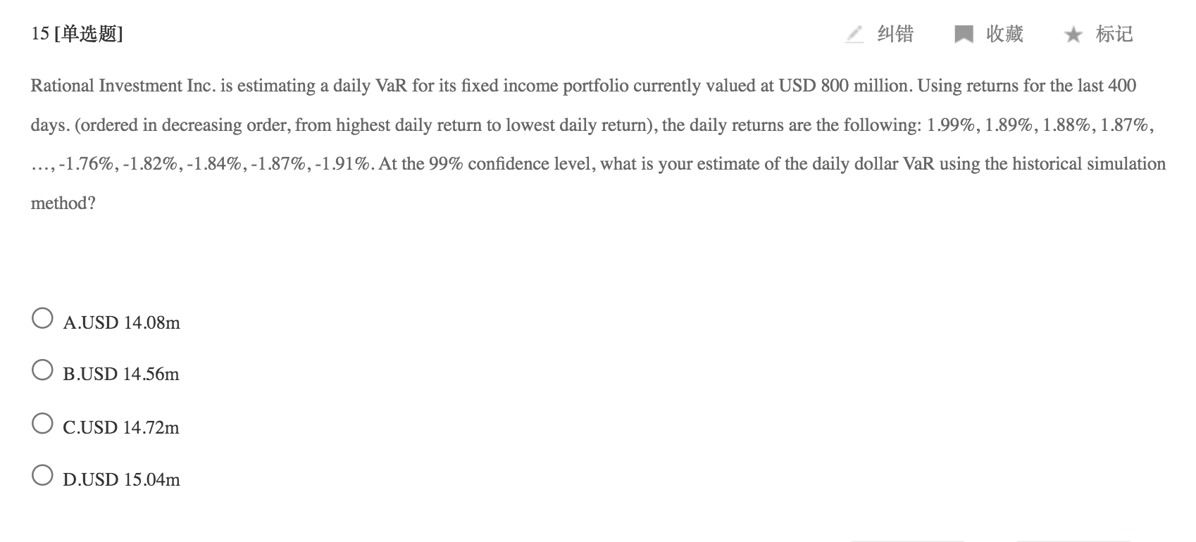 99%的置信水平,意味着只有1%的概率损失会超过var,在400个样本中1%的概率是4个exception,所以var应该是倒数第四个或者倒数第五个损失。至于究竟是倒数第四个还是倒数第五个,garp并没有统一的定论,考试的时候真的遇到这种问题,就拿倒数第四个和倒数第五个都算一算,看看选项中有哪一个就用哪一个。