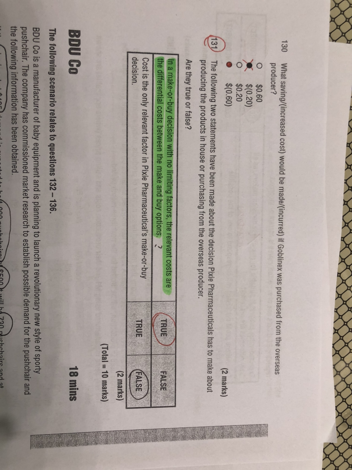 131.在一个没有限制因素的做或买决策中,相关的成本是制造和购买权之间的差异成本。