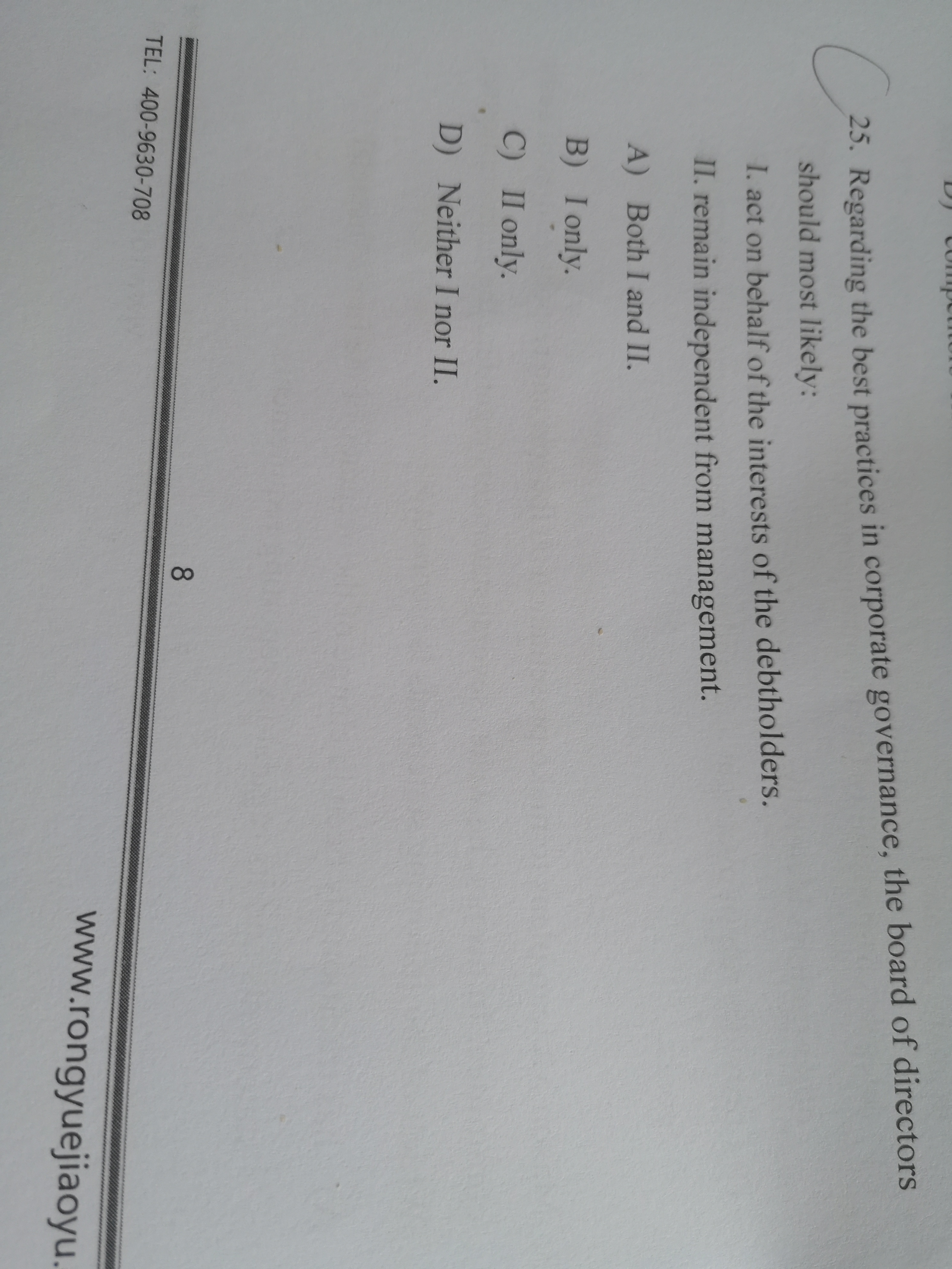同学你好,董事会是on behalf of shareholders(股东) and stakeholders(利益相关者),利益相关者其中之一就是债权人(debtholders),所以A对。