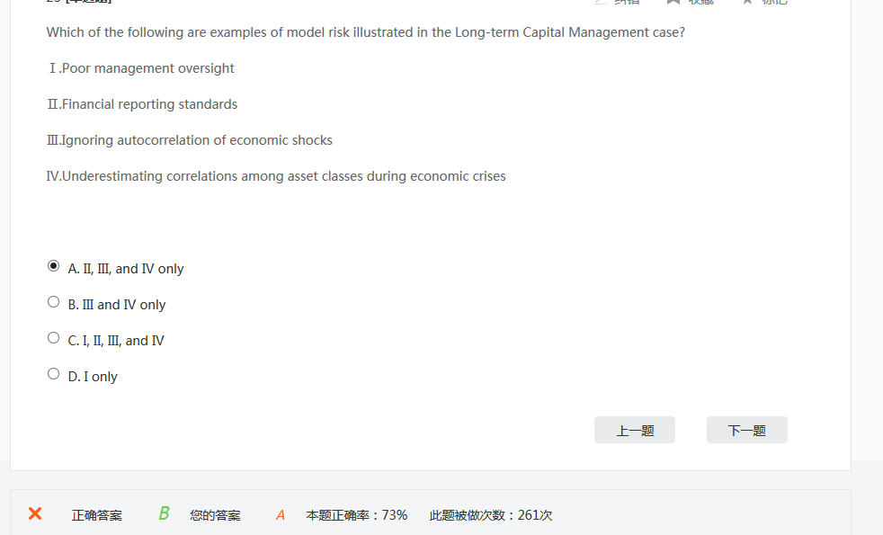 同学你好,长期资本管理基金的案例失败的主要原因就是低估了在经济危机时资产之间的相关性问题,第二种说法归因于财务报表的标准问题显然不合理。
