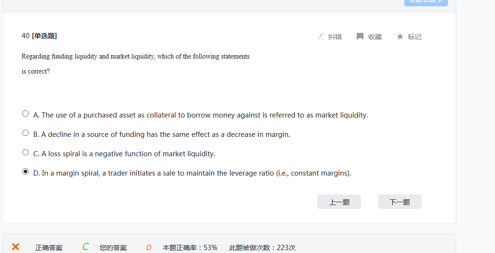 同学你好 损失螺旋 在危机发生时,投资者为了在资产价值缩水、借款能力下降的情况下维持交易保证金(杠杆率),不得不出售相应的资产进行变现而这一行为加剧了资产价值的缩水,进而追使你抛售更多的资产,承受更多的损失。 资产的集中抛售引发的价格下跌反作用于资产抛售的份额,我们把这一循环现象称为损失螺旋(Loss Spiral).损失螺旋是市场流动性恶化的体现,在这个环境下资产价值大幅缩水,市场参与者交易意愿低下,而偿债压力又迫使相关机构不得不以更低的价格出售资产,加速了市场流动性的枯竭。 保证金螺旋 保证金螺旋(Margin Spiral)是指由于保证金或抵押品价值折扣增加而引发的加速损失的过程,当保证金或抵押品折扣增加的时候,投资者必须抛售更多的资产来降低杠杆率(在损失螺旋中,杠杆率是保持不变的),在这样的环境下,信贷会趋于收紧,保证金的要求也会越来越高,从而加速了资产损失。换言之,保证金螺旋加速了损失螺旋的发生。 实例:假设某投资者投资于价值100元的资产,这100元中有10元投资者自身的资本,另外90元是借来的,那么这个投资者现在的杠杆率是10,如果资产价值缩水至95元,投资者的自身资本只剩下了5元,为了维持10倍的杠杆率,必须卖出等值45(95-50)【因为此时总资产只有降到5/10%=50,才能维持10倍的杠杆率,也就是需要卖出45元的资产】元的资产,这就是损失螺旋情景下的具体描述(由于资产下降,为了维持杠杆率的不变而需要变卖资产使得资产缩水,再加上资产的出售会导致价格承压引发更多的抛售,导致资产价格进一步缩水,进而导致融资困难,这种连锁反应就是损失螺旋)。 如果这时交易所要求投资者将杠杆率降低到5倍,那么该投资者则必须卖出等值70(95-25)【因为此时总资产只有降到5/20%=25,才能把杠杆率降到5倍,也就是需要卖出70元的资产】元的资产。当市场上卖出的资产越来越多时,资产价格就会下降,信贷也会趋于收紧。这就是保证金螺旋情景下的具体描述。 损失螺旋和保证金螺旋的区别和联系: 相较于损失螺旋效应,保证金螺旋使资产整体规模下降得更严重,可用于融资的资金也大幅减少,进一步放大了损失螺旋的效应。