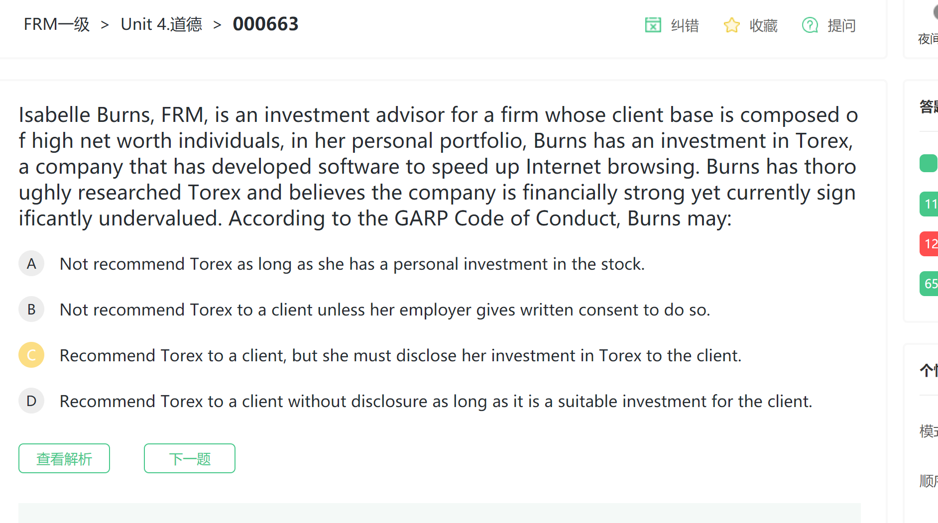 同学你好,答案没错,只要是适合客户的,是不用把自己的持仓情况披露给客户的,FRM道德没有CFA那么严。