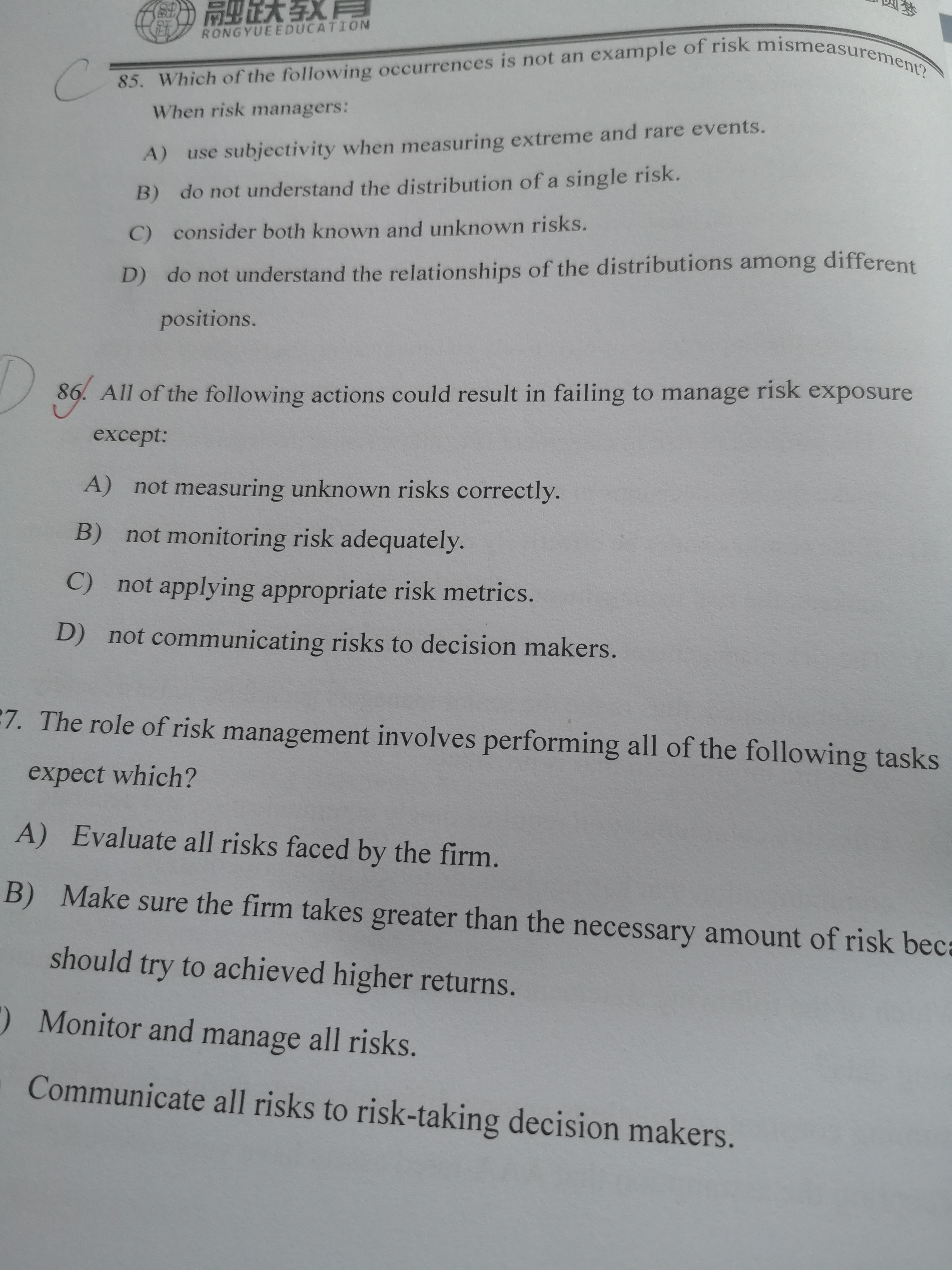 同学你好,A选项应该是未能正确衡量已知风险,而不是未知风险。D选项未与决策者沟通风险可能会导致风险管理失败。