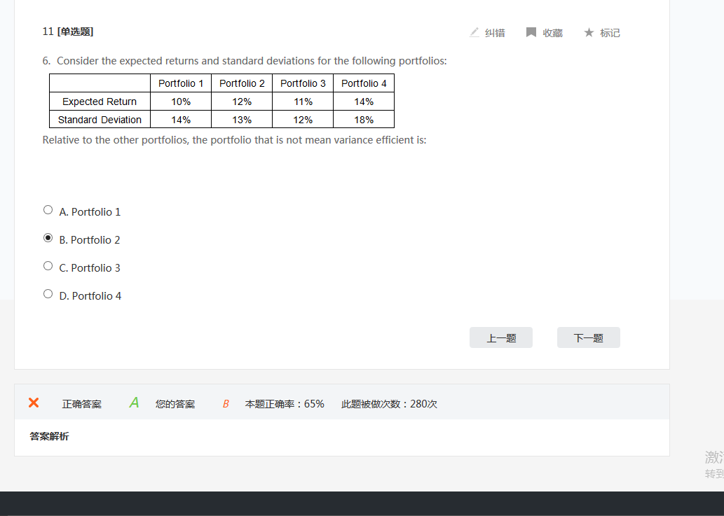 同学你好,把四个组合的均值方差数据划到坐标轴,可以看出组合2、3、4基本都在有效边界上,只有组合1不在,所以选A