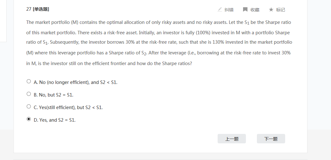 同学你好,不管投资者加了多少杠杆,他的组合都是在CML线上,而CML线的斜率为夏普比率,斜率不变,所以S2=S1