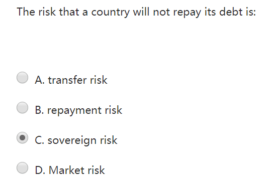 同学你好,A是汇兑风险,B是还款风险,C是主权违约风险。