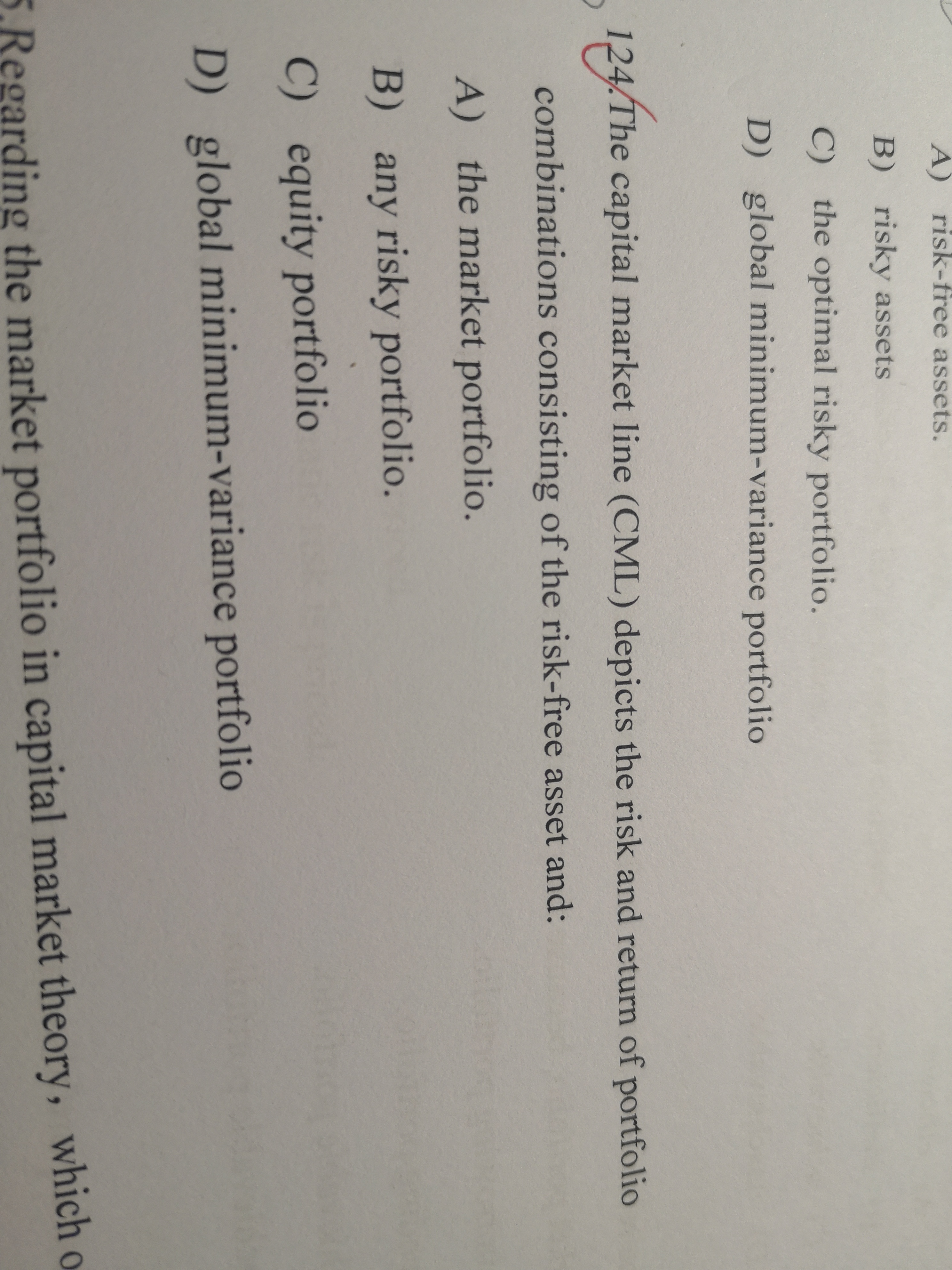 你好,CML线包括的是无风险资产和市场组合的组合,市场组合指的是在所有投资者都具有相同的风险投资组合有效前沿上的最优风险投资组合,并不是仅仅是任何的风险组合。
