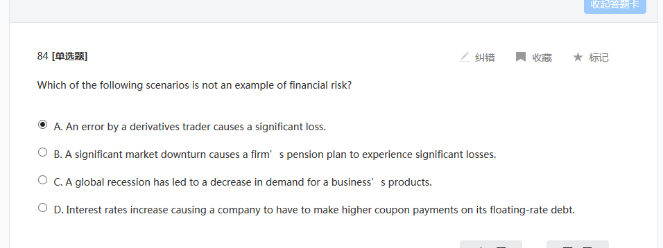 同学你好,A选项是操作风险,属于financial risk ,题目问的是不属于financial risk 的是哪个,C选项属于宏观经济的风险,不属于financial risk,所以选C