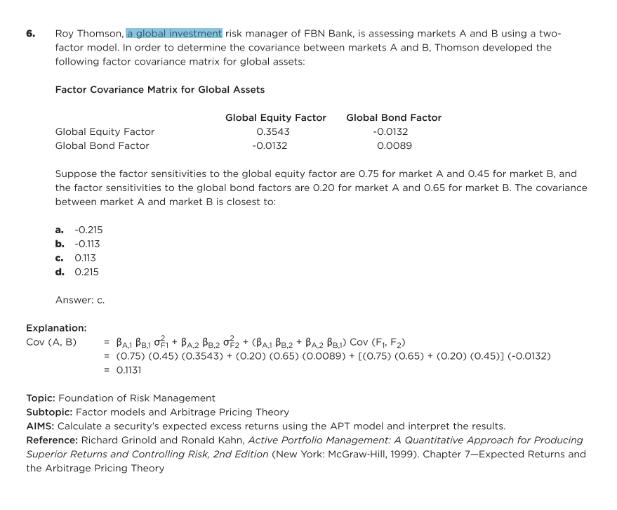 同学你好,这道题其实就是让计算市场A和市场B之间的协方差,只不过市场A是债券和权益两个因素的线性组合,同理,市场B也是;而线性组合之间的协方差公式相对复杂一点,具体计算过程参考图片理解