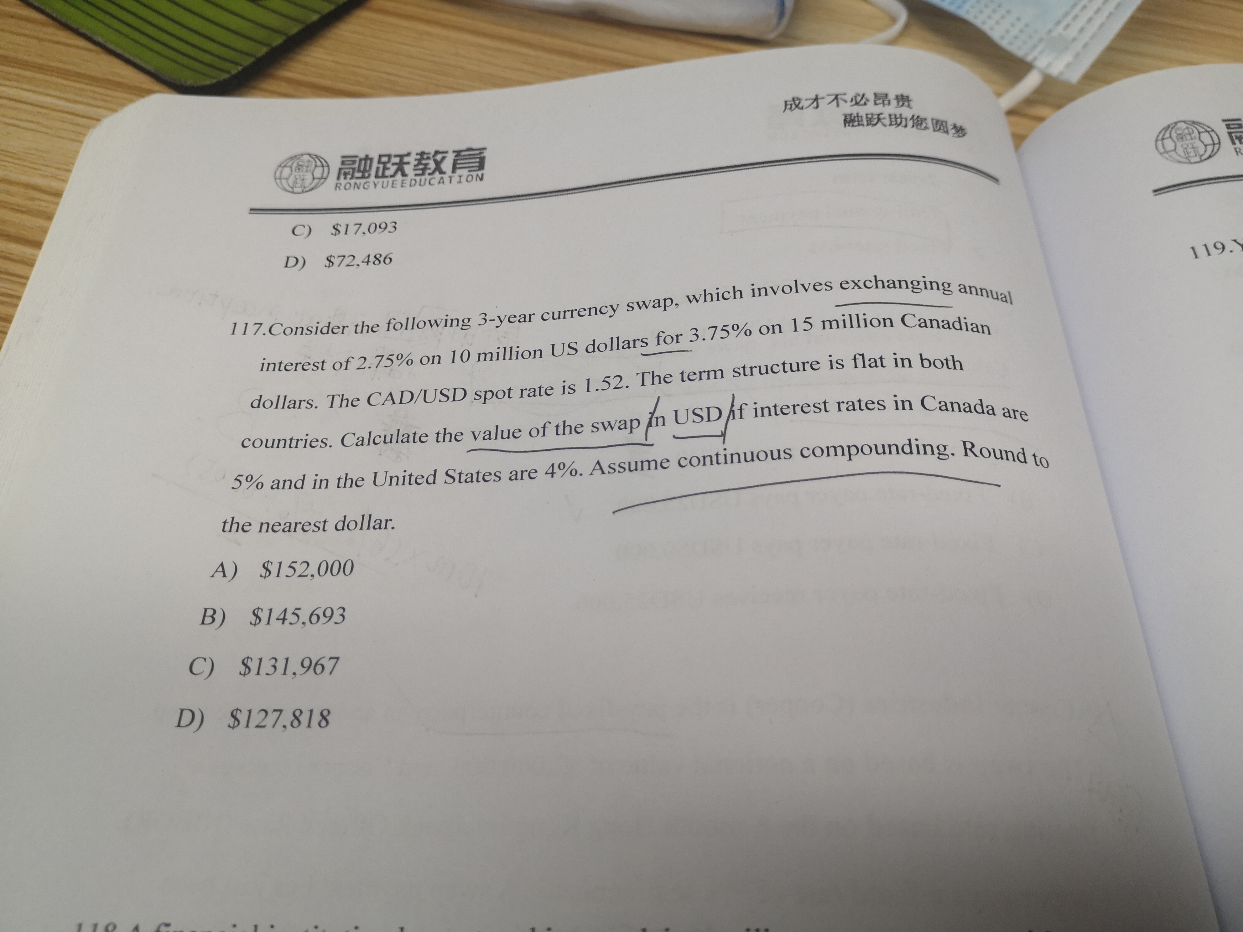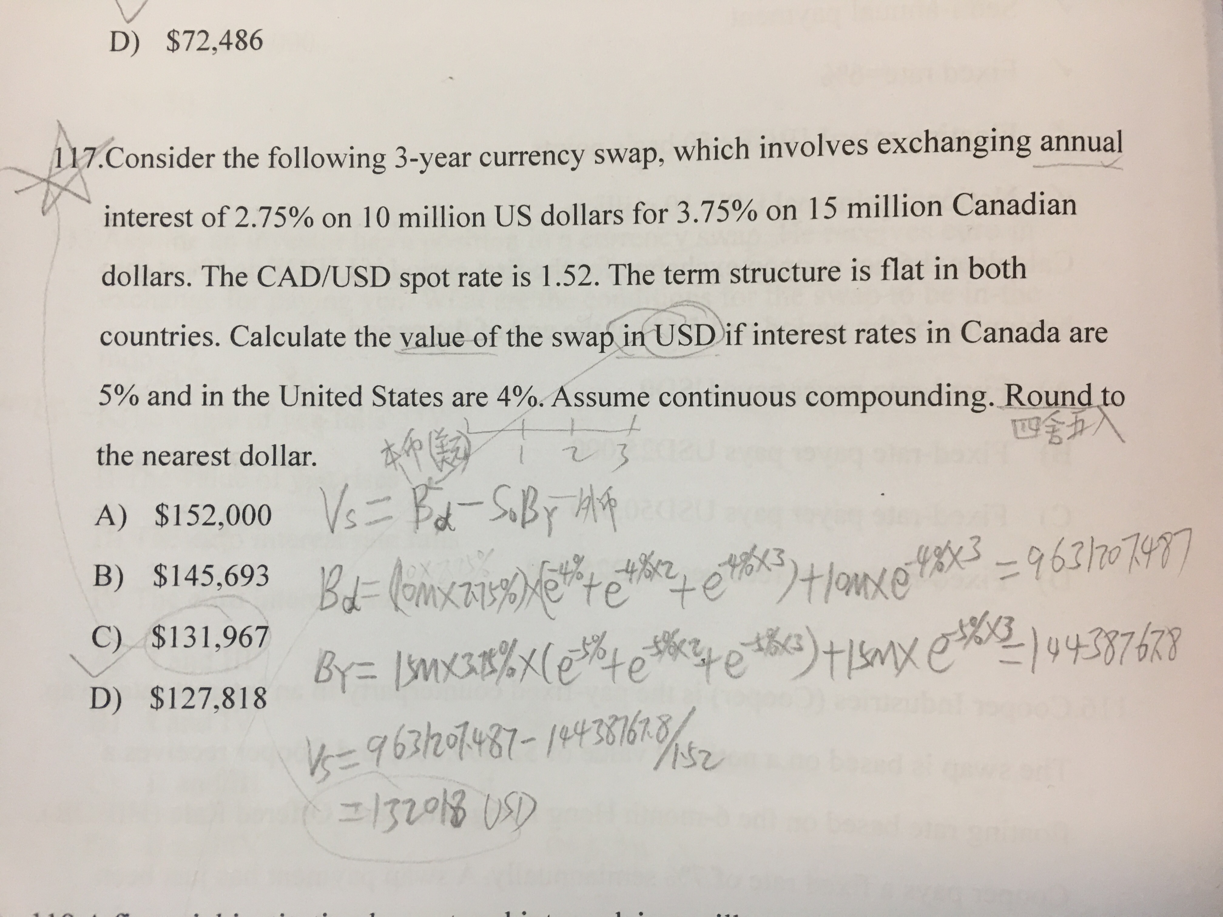 同学你好,计算互换合约的价值的时候,先确定本币和外币,根据题意一般以哪种货币计价就是哪种货币为本币 ,这道题里面求以美元计价的互换合约价值,那么本币就是美元,以本币的现值减去外币通过即期汇率转换成的本币价值就是互换合约的价值,带入互换合约价值计算公式计算即可,具体计算参考图片。