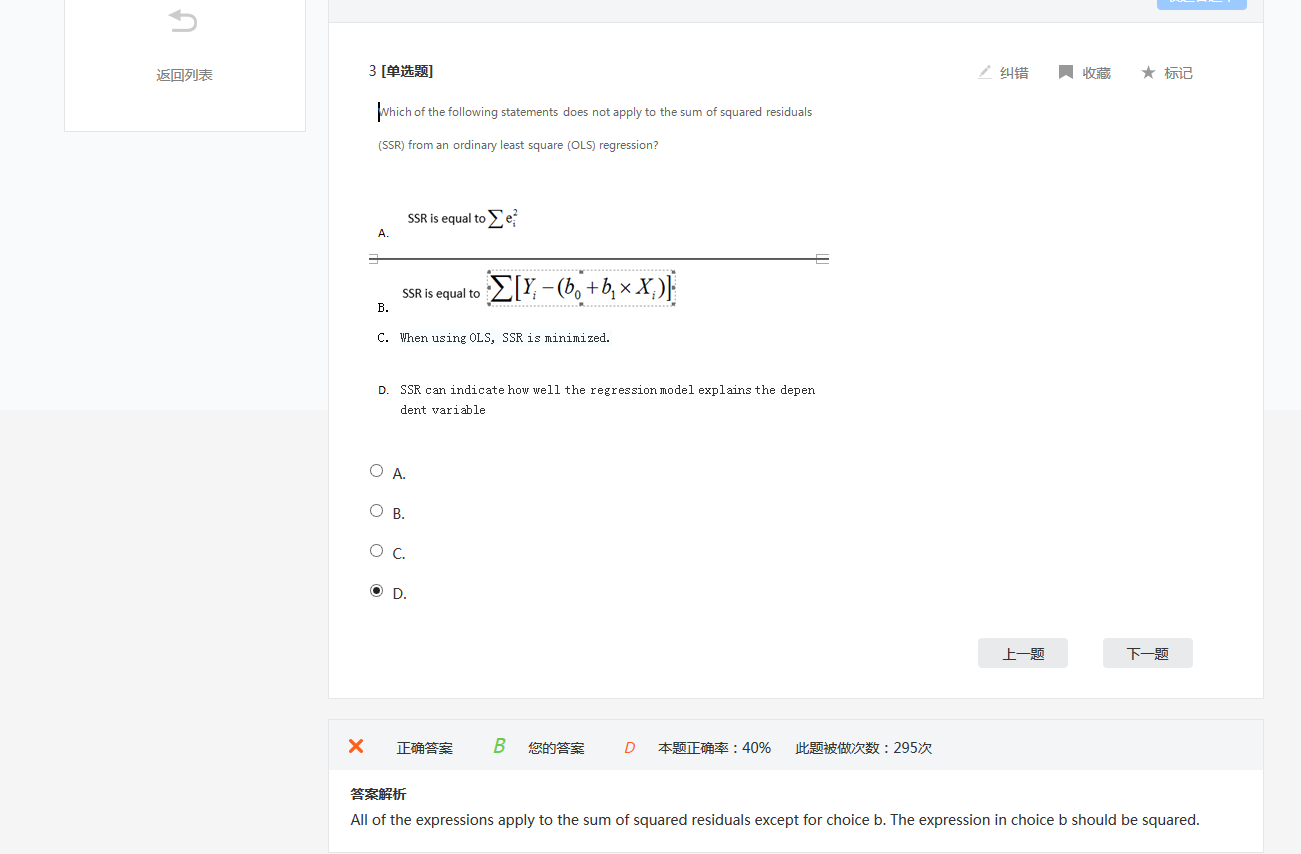 同学你好,R方=ESS/TSS=1-SSR/TSS,D选项仅仅说的是SSR。