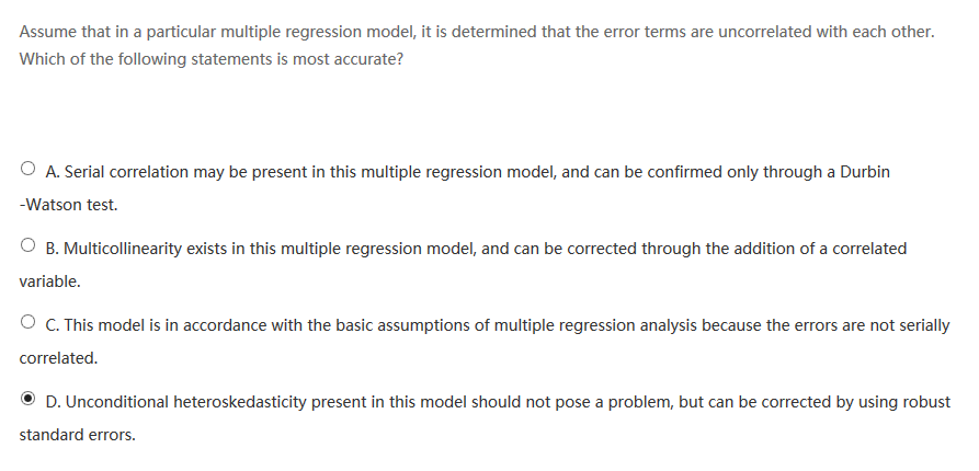 同学你好,多元线性回归的前提条件之一就是不存在序列相关,所以C对,A错,多重共线性的问题可以利用逐步回归法和主成分分析法解决,所以B错。非条件异方差肯定会构成一个问题,会导致回归系数的方差估计不准确,进而导致t检验统计量估计有误,最终导致对回归系数的统计推断不准确,所以D错。