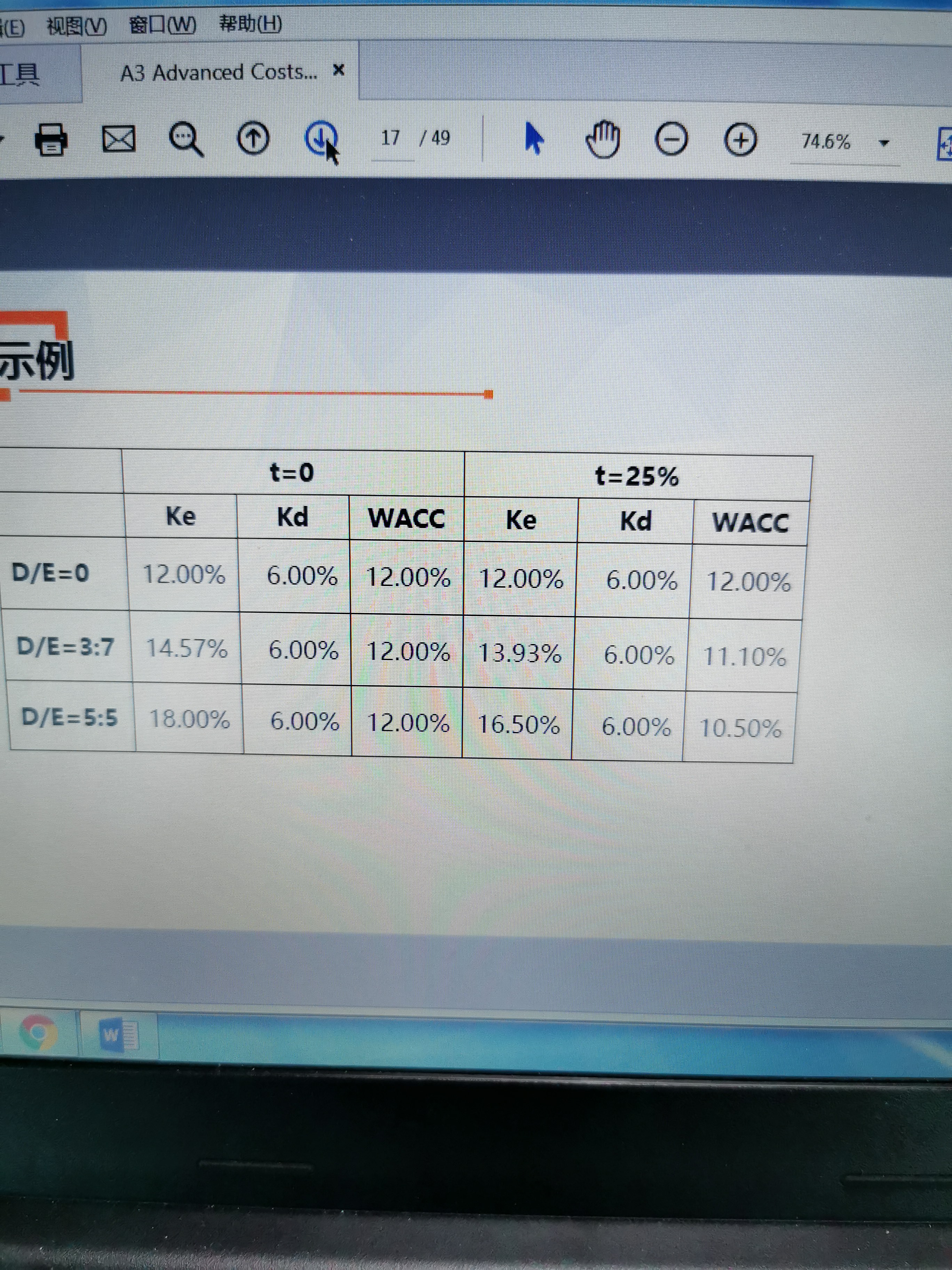 我们考试的时候可以用3种方法求Ke 一种是CAPM下Ke=Rf+βe(Rm-Rf) 当题目中给了Rf 还有β值时我们用这种方法,但是如果题目没有给,那我们就要用M&M理论下的给的Kei来求。看题目给的条件。同时我们还可以用DVM下的ke=D0(1+g)/P0+g 然后我们求出Ke 就可以带入求得WACC,当WACC公式中其他变量已知的时候我们就可以倒推出Ke,如果题目让是要kei 我们就可以用M&M 的公式倒推出kei
