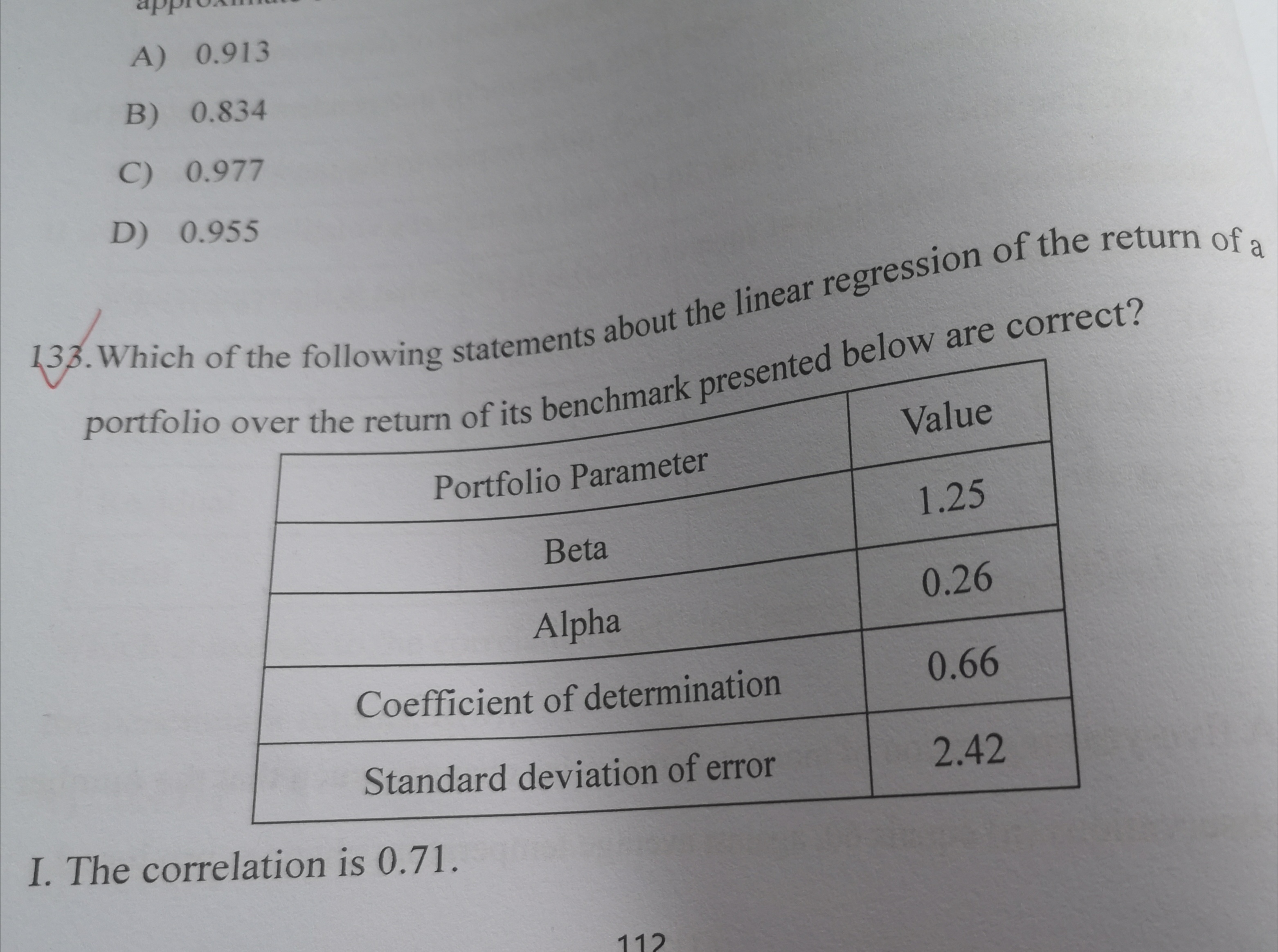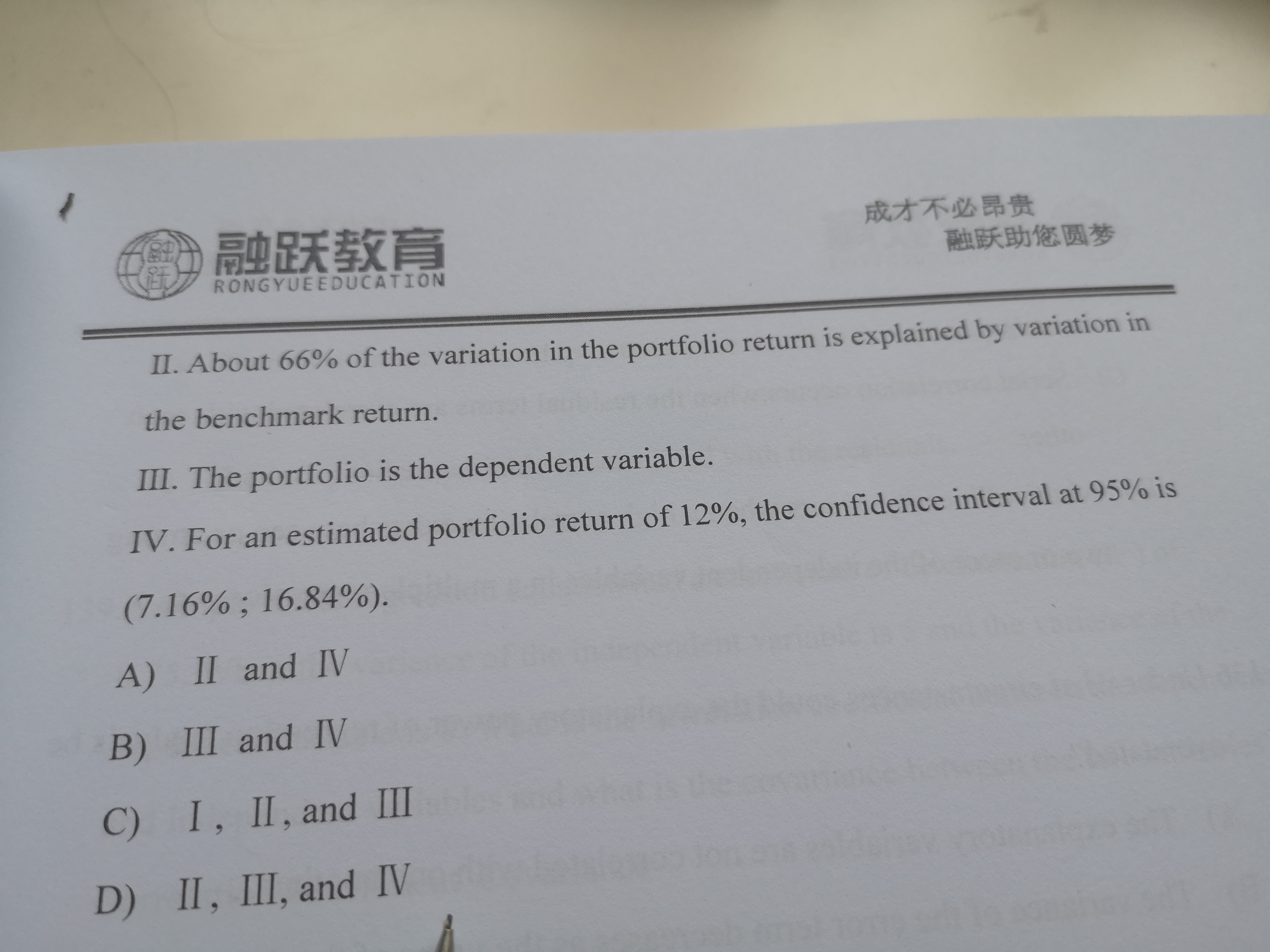 同学你好,第二个说法应该是34%,是打印错了,第三个说法,根据题意关于组合收益对于基准的表现。基准是自变量,组合就是因变量。