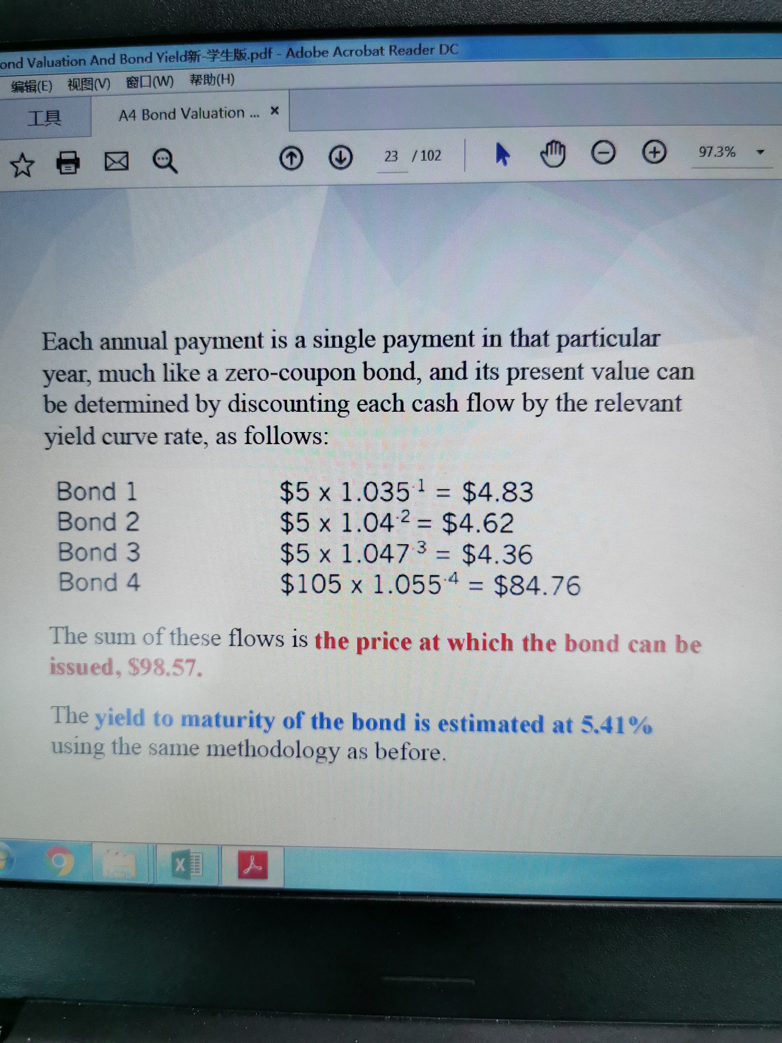 98.5*(1+r)^4=105,r=4.42%,跟蓝色字部分5.41%不同